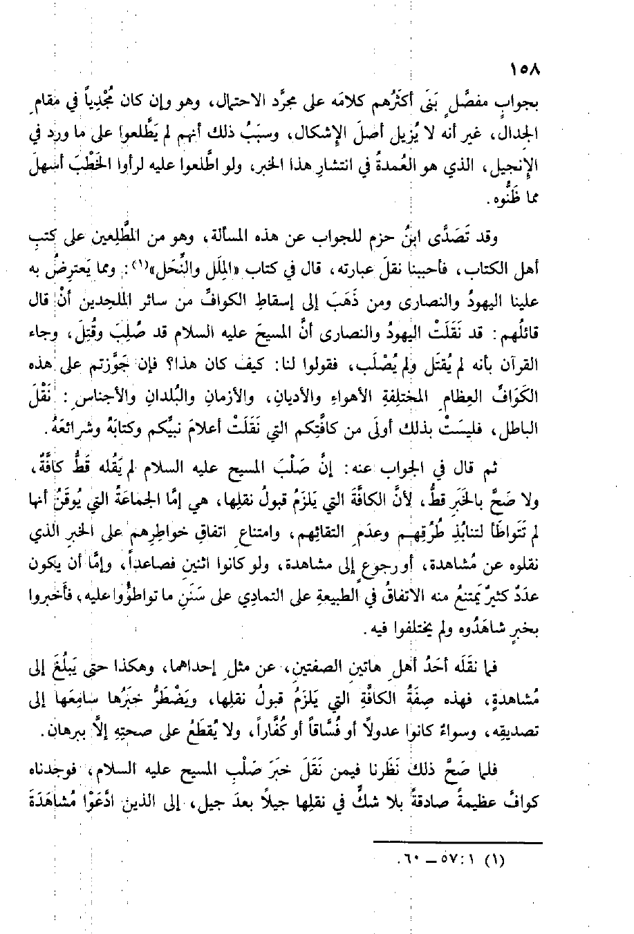وَقد تصدى ابْن حزم للجواب عَن هَذِه المسالة وَهُوَ من المطلعين على كتب أهل الْكتاب فأحببنا نقل عِبَارَته قَالَ فِي كتاب الْملَل والنحل وَمِمَّا يعْتَرض بِهِ علينا الْيَهُود وَالنَّصَارَى ة وَمن ذهب إِلَى إِسْقَاط الكواف من سَائِر الْمُلْحِدِينَ ان قَالَ قَائِلهمْ قد نقلت الْيَهُود وَالنَّصَارَى أَن الْمَسِيح عَلَيْهِ السَّلَام قد صلب وَقتل وَجَاء الْقُرْآن بِأَنَّهُ لم يقتل وَلم يصلب فَقولُوا لنا كَيفَ كَانَ هَذَا فَإِن جوزتم على هَذِه الكواف الْعِظَام الْمُخْتَلفَة الْهَوَاء وَالديَّان والأزمان والبلدان والأجناس نقل الْبَاطِل فَلَيْسَتْ بذلك أولى من كافتكم الَّتِي نقلت أَعْلَام نَبِيكُم وَكتابه وشرائعه
