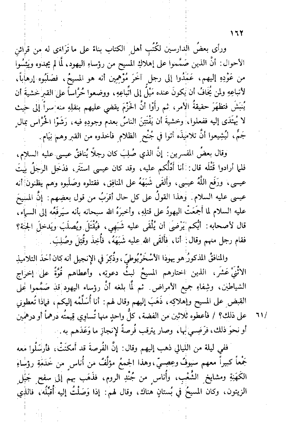 وَقَالَ بعض الْمُفَسّرين إِن الَّذِي صلب كَانَ رجلا ينافق عِيسَى عَلَيْهِ السَّلَام فَلَمَّا أَرَادوا قَتله قَالَ انا أدلكم عَلَيْهِ وَقد كَانَ عِيسَى استتر فَدخل الرجل بَيت عِيسَى وَرفع الله عِيسَى وَألقى شبهه على الْمُنَافِق فَقَتَلُوهُ وصلبوه وه يظنون أَنه عِيسَى عَلَيْهِ السَّلَام وَهَذَا القَوْل على كل ال أقرب من قَول بَعضهم إِن الْمَسِيح عَلَيْهِ السَّلَام لما أَجمعت الْيَهُود على قَتله وَأخْبرهُ الله سُبْحَانَهُ بِأَنَّهُ سيرفعه إِلَى السَّمَاء قَالَ لأَصْحَابه أَيّكُم يرضى أَن يلقى عَلَيْهِ شبهه فَيقْتل ويصلب وَيدخل الْجنَّة فَقَامَ رجل مِنْهُم وَقَالَ أَنا فَألْقى الله عَلَيْهِ شبهه فَأخذ وَقتل وصلب