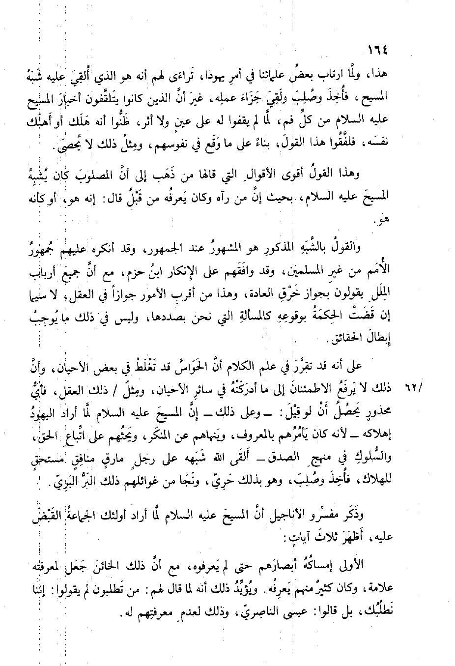 على انه تقرر فِي علم الْكَلَام أَن الْحَواس قد تغلط فِي بعض الأحيان وَأَن ذَلِك لَا يرفع الاطمئنان إِلَى مَا أَدْرَكته فِي سَائِر الأحيان وَمثل ذَلِك الْعقل فَأَي مَحْذُور يحصل أَن قيل وعَلى ذَلِك إِن الْمَسِيح عَلَيْهِ السَّلَام لما أَرَادَ الْيَهُود إهلاكه لِأَنَّهُ كَانَ يَأْمُرهُم بِالْمَعْرُوفِ وينهاهم عَن الْمُنكر ويحثهم على اتِّبَاع الْحق والسلوك فِي مهج الصدْق ألْقى الله شبهه على رجل مارق مُنَافِق مُسْتَحقّ للهلاك فَأخذ وصلب وَهُوَ بذلك حري وَنَجَا من غوائلهم ذَلِك الْبر الْبري