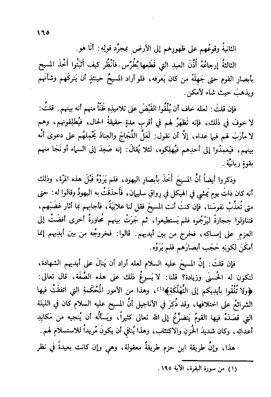 فَإِن قلت إِن الْمَسِيح عَلَيْهِ السَّلَام لَعَلَّه أَرَادَ أَن ينَال على أَيْديهم الشَّهَادَة لتَكون لَهُ الْحسنى وَزِيَادَة قُلْنَا لَا يسوغ ذَلِك على هَذِه الصّفة قَالَ تَعَالَى {وَلَا تلقوا بِأَيْدِيكُمْ إِلَى التَّهْلُكَة} وَهَذَا من الْأُمُور المحكمة الَّتِي اتّفقت فِيهَا الشَّرَائِع على اختلافها وَقد ذكر فِي الأناجيل أَن الْمَسِيح عَلَيْهِ السَّلَام كَانَ فِي اللَّيْلَة الَّتِي قَصده فِيهَا الْقَوْم يتَضَرَّع إِلَى الله تَعَالَى كثيرا ويسأله أَن ينجيه من مكايد أعدائه وَكَانَ شَدِيد الْحزن والاكتئاب وَهَذَا يُنَافِي أَن يكون مرِيدا للاستسلام لَهُم