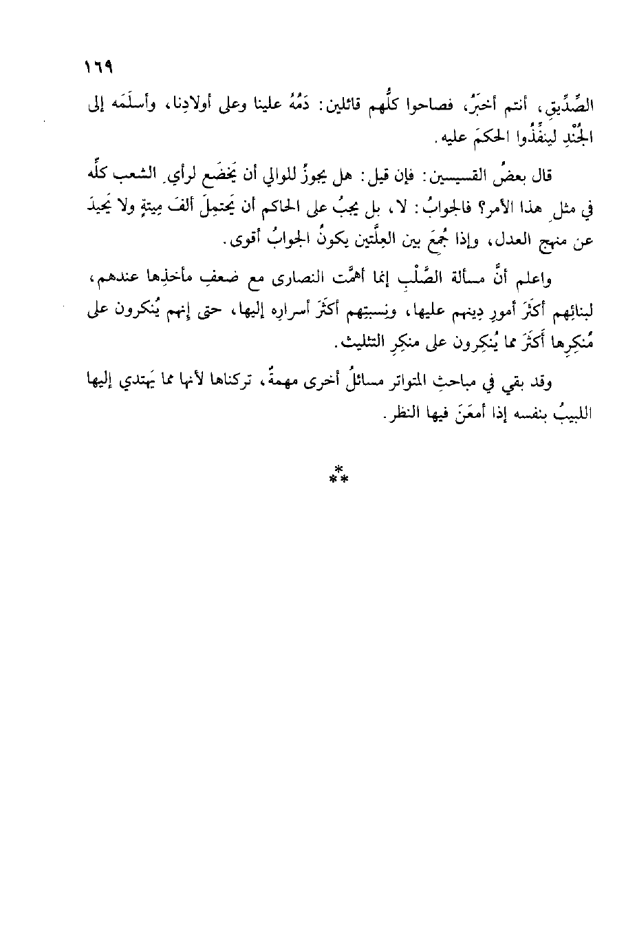 قَالَ بعض القسيسين فَإِن قيل يجوز للوالي أَن يخضع لرأي الشّعب كُله فِي مثل هَذَا الْأَمر فَالْجَوَاب لَا بل يجب على الْحَاكِم أَن يحْتَمل ألف ميتَة وَلَا يحيد عَن مَنْهَج الْعدْل وَإِذا جمع بَين العلتين يكون الْجَواب أقوى