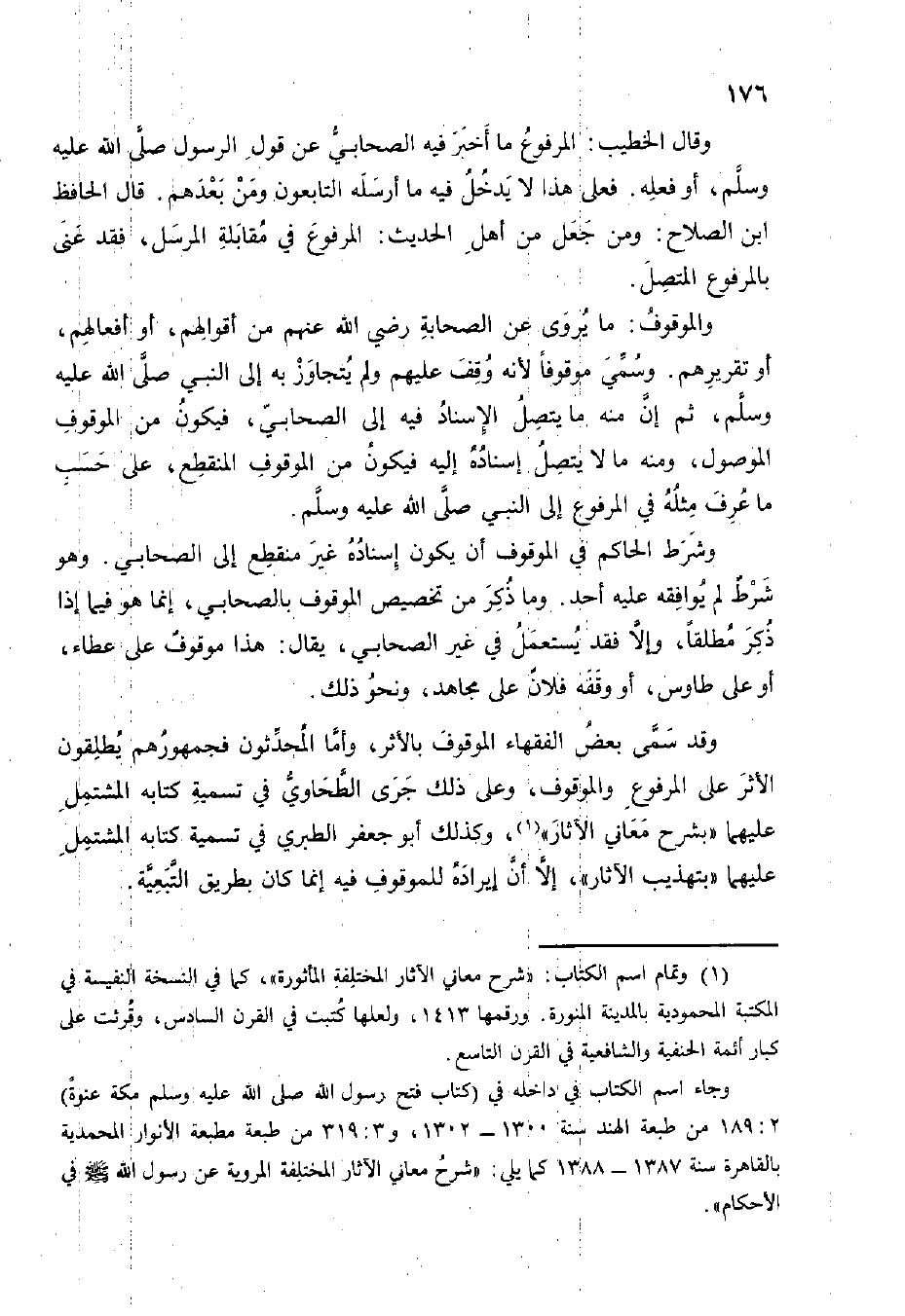 وَقد سمى بعض الْفُقَهَاء الْمَوْقُوف بالأثر وَأما المحدثون فجمهورهم يطلقون الْأَثر على الْمَرْفُوع وَالْمَوْقُوف وعَلى ذَلِك جرى الطَّحَاوِيّ فِي تَسْمِيَة كِتَابه الْمُشْتَمل عَلَيْهِمَا بشرح مَعَاني الْأَثر وَكَذَلِكَ أَبُو جَعْفَر الطَّبَرِيّ فِي تَسْمِيَة كِتَابه الْمُشْتَمل عَلَيْهِمَا بتهذيب الْآثَار إِلَّا أَن إِيرَاده للْمَوْقُوف فِيهِ إِنَّمَا كَانَ بطرِيق التّبعِيَّة