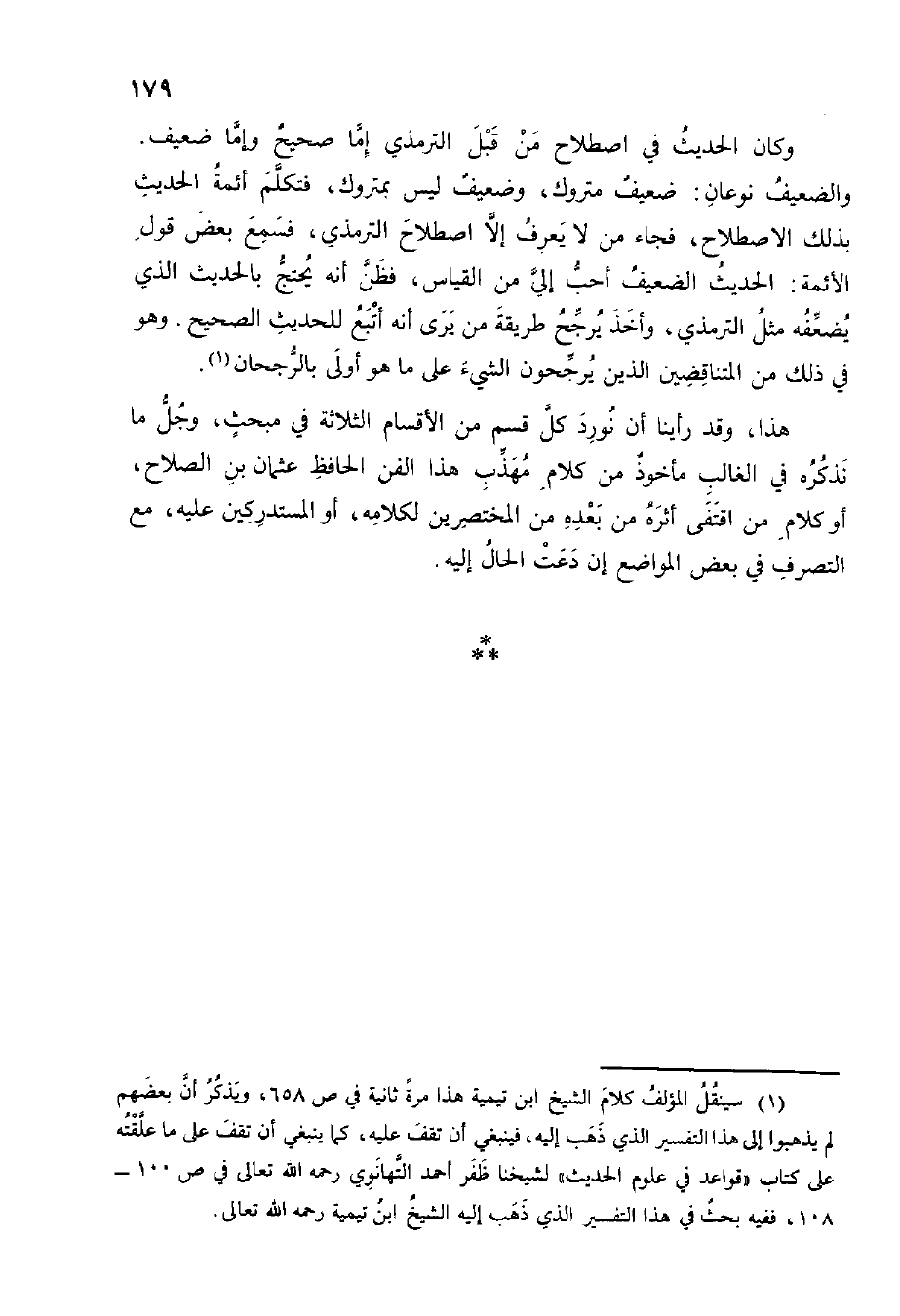 وَكَانَ الحَدِيث فِي اصْطِلَاح من قبل التِّرْمِذِيّ إِمَّا صَحِيح وَإِمَّا ضَعِيف والضعيف نَوْعَانِ ضَعِيف مَتْرُوك وَضَعِيف لَيْسَ بمتروك فَتكلم أَئِمَّة الحَدِيث بلك الِاصْطِلَاح فجَاء من لَا يعرف لَا اصْطِلَاح التِّرْمِذِيّ فَسمع بعض قَول الْأَئِمَّة الحَدِيث الضَّعِيف أحب إِلَيّ من الْقيَاس فَظن أَنه يحْتَج بِالْحَدِيثِ الَّذِي يُضعفهُ مثل التِّرْمِذِيّ وَأخذ يرجح طَرِيقه من يرى أَنه اتبع للْحَدِيث الصَّحِيح وَهُوَ فِي ذَلِك من المتناقضين الَّذين يرجحون الشَّيْء على مَا هُوَ أولى بالرجحان