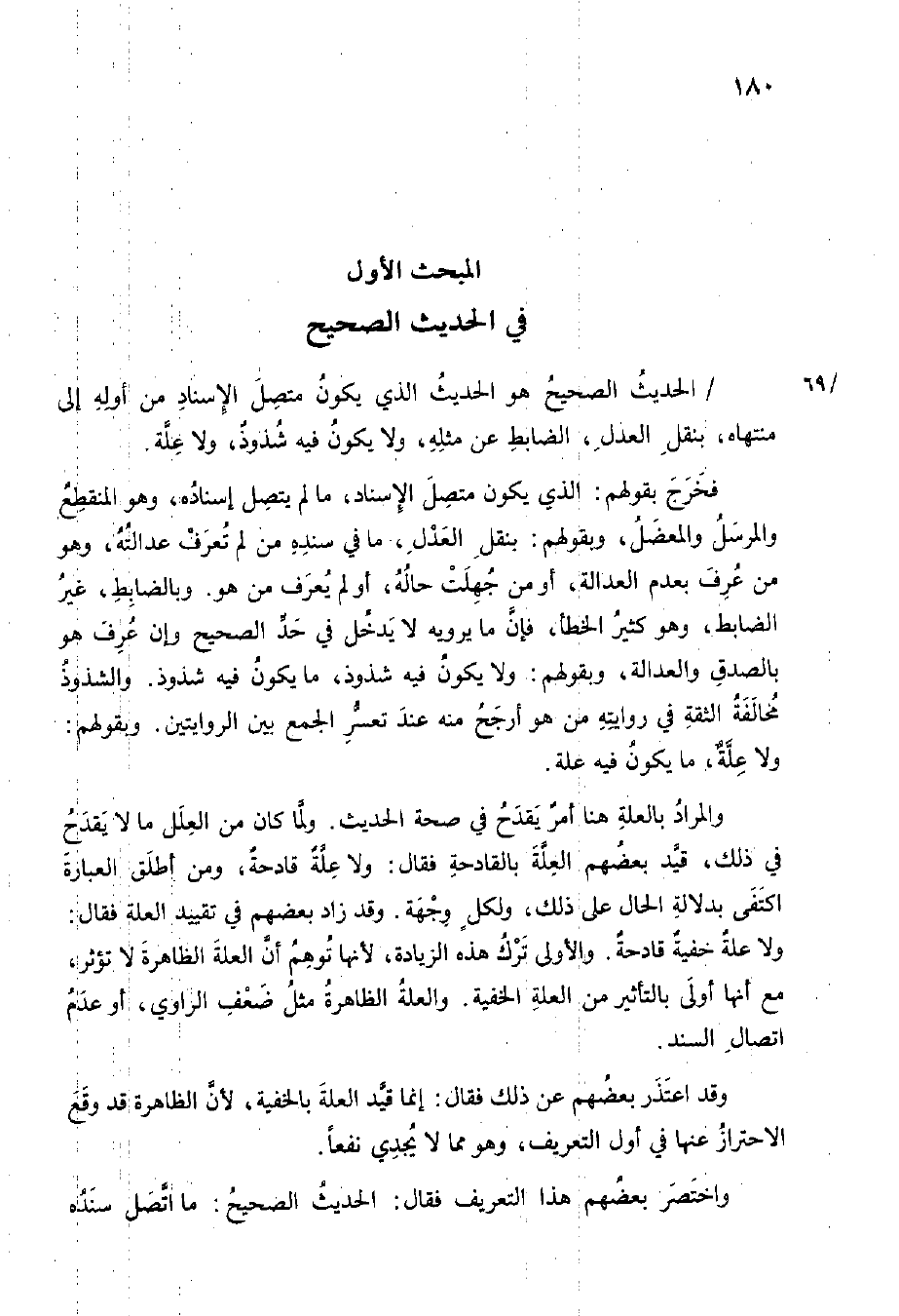 الحَدِيث الصَّحِيح هُوَ الحَدِيث الَّذِي يكون مُتَّصِل الْإِسْنَاد من أَوله إِلَى منتهاه بِنَقْل الْعدْل الضَّابِط عَن مثله وَلَا يكون فِيهِ شذوذ وَلَا عِلّة