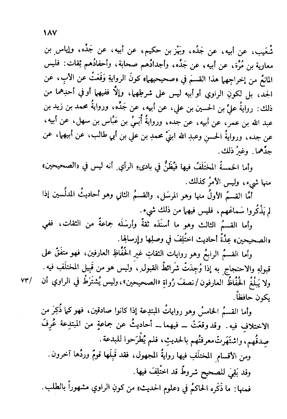 شُعَيْب عَن أَبِيه عَن جده وبهز بن حَكِيم عَن أَبِيه عَن جده وَإيَاس بن مُعَاوِيَة بن مرّة عَن أَبِيه عَن جده وأجدادهم صحابة وأحفادهم ثِقَات فَلَيْسَ الْمَانِع من إخراجهما هَذَا الْقسم فِي صَحِيحهمَا كَون الرِّوَايَة وَقعت عَن الْأَب عَن الْجد بل لكَون الرَّاوِي أَو أَبِيه لَيْسَ على شَرطهمَا وَإِلَّا ففيهما أَو فِي أَحدهمَا من ذَلِك رِوَايَة عَليّ بن الْحُسَيْن بن عَليّ عَن أَبِيه عَن جده وَرِوَايَة مُحَمَّد بن زيد بن عبد الله بن عمر عَن أَبِيه عَن جده وَرِوَايَة أبي بن عَبَّاس بن سهل عَن أَبِيه عَن جده وَرِوَايَة الْحسن وَعبد الله ابْني مُحَمَّد بن عَليّ بن أبي طَالب عَن أَبِيهِمَا عَن جدهما وَغير ذَلِك