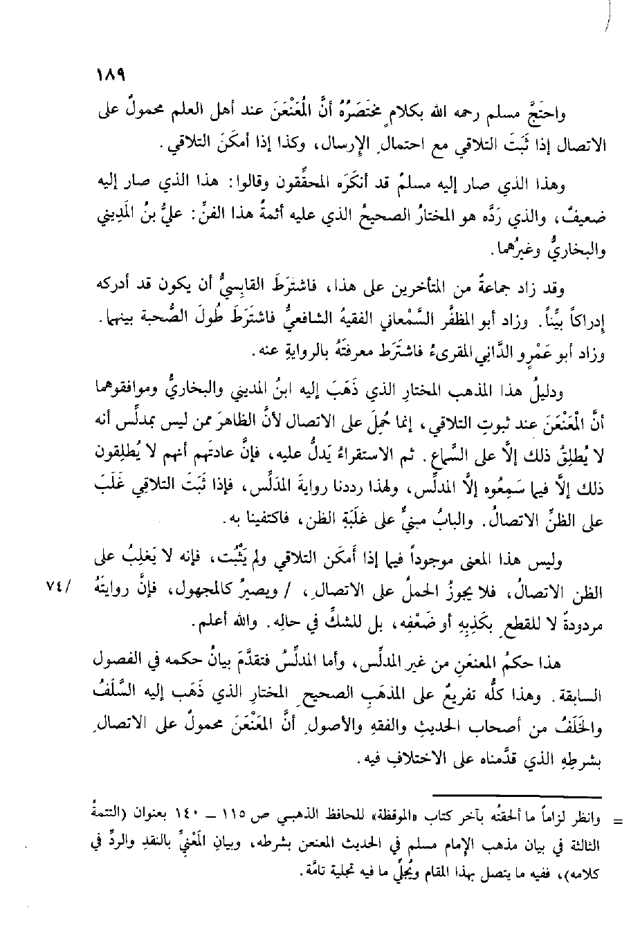 وَاحْتج مُسلم رَحمَه الله بِكَلَام مختصرة أَن المعنعن عِنْد أهل الْعلم مَحْمُول على الِاتِّصَال إِذا ثَبت التلاقي مَعَ احْتِمَال الْإِرْسَال وَكَذَا إِذا أمكن التلاقي