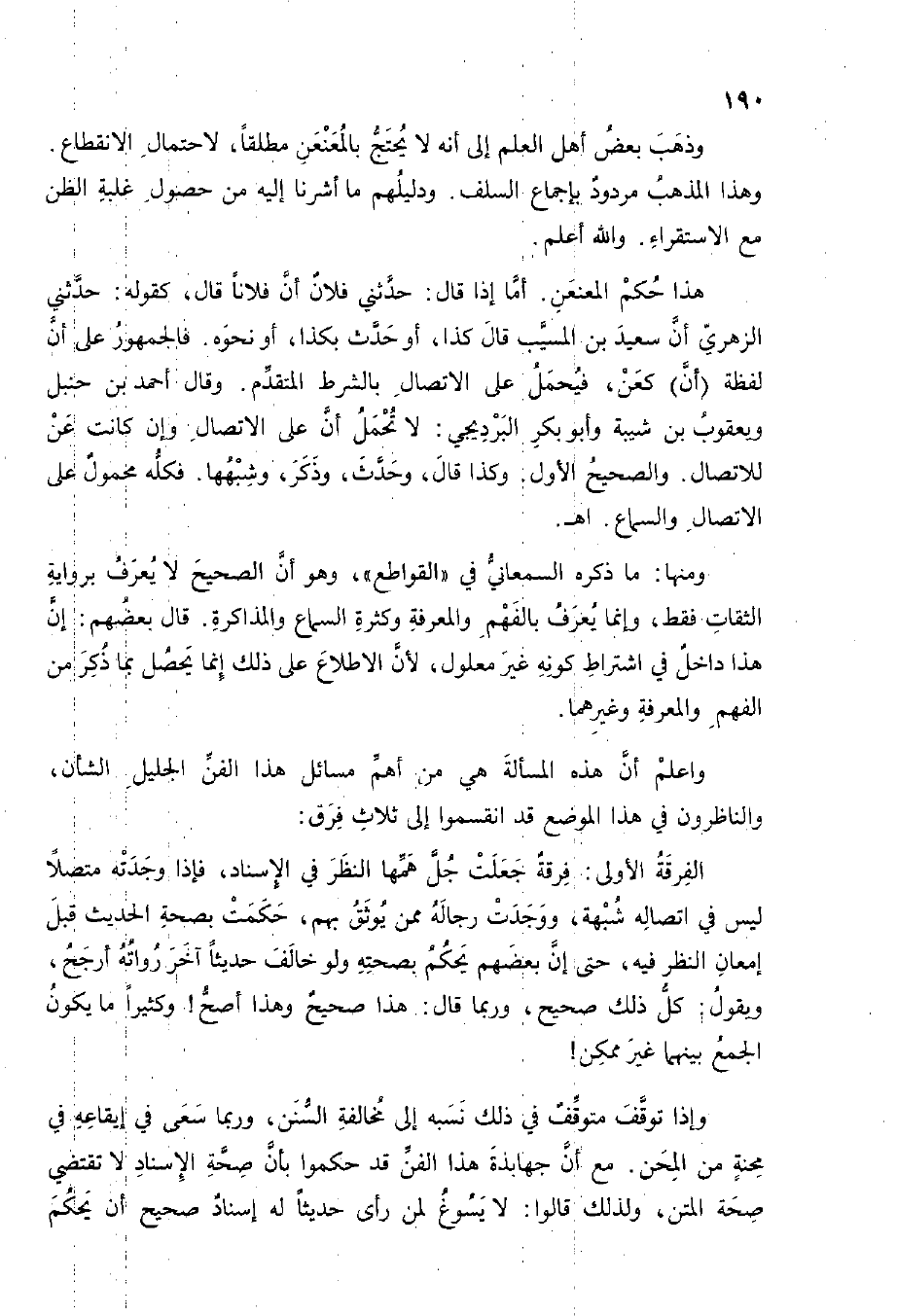 وَذهب بعض أهل الْعلم إِلَى أَنه لَا يحْتَج بالمعنعن مُطلقًا لاحْتِمَال الِانْقِطَاع وَهَذَا الْمَذْهَب مَرْدُود بِإِجْمَاع السّلف ودليلهم مَا أَشَرنَا إِلَيْهِ من حُصُول غَلَبَة الظَّن مَعَ الاستقراء وَالله اعْلَم