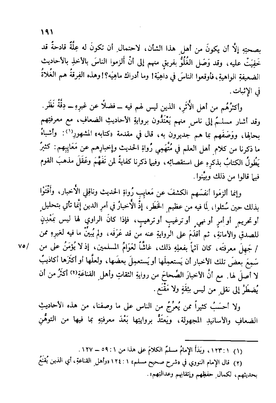 وَأَكْثَرهم من أهل الْأَثر الَّذين لَيْسَ بهم فِيهِ فضلا عَن غَيره دقة نظر وَقد أَشَارَ مُسلم إِلَى نَاس مِنْهُم يعتدون بِرِوَايَة الْأَحَادِيث الضِّعَاف مَعَ معرفتهم بِحَالِهَا ووصفهم بِمَا هم جديرون بِهِ قَالَ فِي مُقَدّمَة كِتَابه الْمَشْهُور وَأَشْبَاه مَا ذكرنَا من كَلَام أهل الْعلم فِي متهمي رُوَاة الحَدِيث وإخبارهم عَن معايبهم كثير يطول الْكتاب بِذكرِهِ على اسْتِقْصَائِهِ وَفِيمَا ذكرنَا كِفَايَة لمن تفهم عقل مَذْهَب الْقَوْم فِيمَا قَالُوا من ذَلِك وبينوا