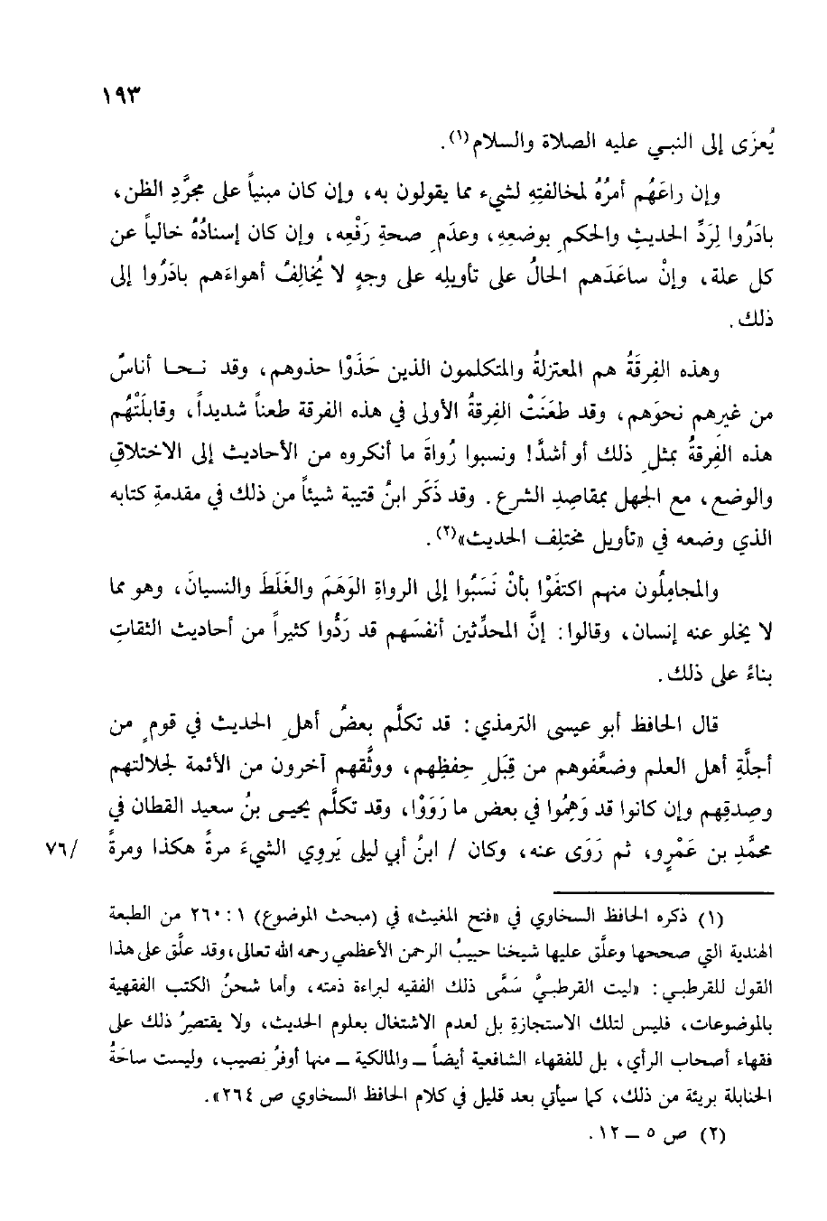 وَهَذِه الْفرْقَة هم الْمُعْتَزلَة والمتكلمون الَّذين حذوا حذوهم وَقد نحا أنَاس م غَيرهم نحوهم وَقد طعنت الْفرْقَة الأولى فِي هَذِه الْفرْقَة طَعنا شَدِيدا وقابلتهم هَذِه الْفرْقَة بِمثل بِمثل ذَلِك أَو أَشد نسبوا رُوَاة مَا أنكروه من الْأَحَادِيث إِلَى الاختلاق والوضع مَعَ الْجَهْل بمقاصد الشَّرْع وَقد ذكر ابْن قُتَيْبَة شَيْئا من ذَلِك فِي مُقَدّمَة كِتَابه الَّذِي وَضعه فِي تَأْوِيل مُخْتَلف الحَدِيث