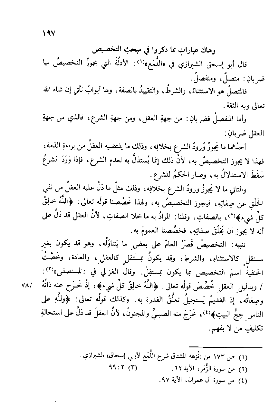تَنْبِيه التَّخْصِيص قصر الْعَام على بعض مَا يتَنَاوَلهُ وَهُوَ قد يكون بِغَيْر مُسْتَقل كالاستثناء وَالشّرط وَقد يكون بمستقل كالعقل وَالْعَادَة وخصت الْحَنَفِيَّة اسْم التَّخْصِيص بِمَا يكون بمستقل وَقَالَ الْغَزالِيّ فِي الْمُسْتَصْفى وبدليل الْعقل خصص قَوْله تَعَالَى {الله خَالق كل شَيْء} إِذْ خرج عَنهُ ذَاته وَصِفَاته إِذْ الْقَدِيم يَسْتَحِيل تعلق الْقُدْرَة بِهِ وَكَذَلِكَ قَوْله تَعَالَى وَللَّه على النَّاس حج الْبَيْت) خرج مِنْهُ الصَّبِي وَالْمَجْنُون لِأَن الْعقل قد دلّ على اسْتِحَالَة تَكْلِيف من لَا يفهم