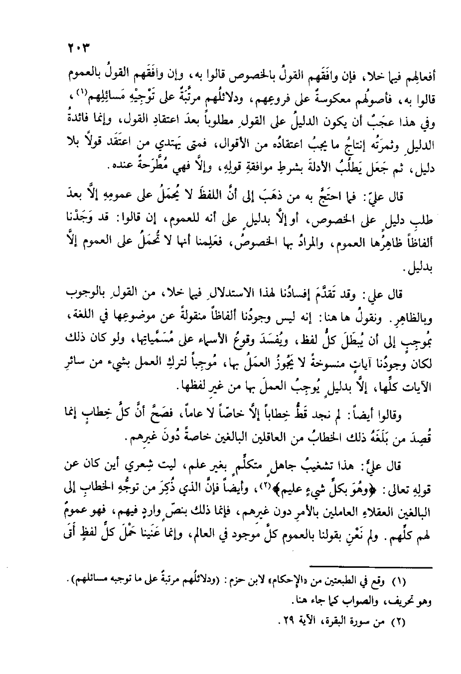 قَالَ عَليّ فَمَا احْتج بِهِ من ذهب إِلَى اللَّفْظ لَا يحمل على عُمُومه إِلَى بعد طلب دَلِيل على الْخُصُوص أَو إِلَّا بِدَلِيل على انه للْعُمُوم إِن قَالُوا قد وجدنَا ألفاظا ظَاهرهَا الْعُمُوم وَالْمرَاد بهَا الْخُصُوص فَعلمنَا أَنَّهَا لَا تحمل على الْعُمُوم إِلَّا بِدَلِيل
