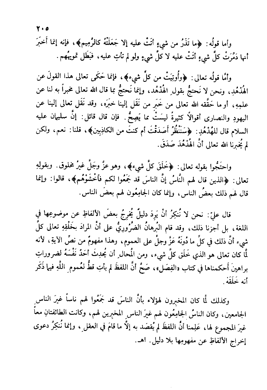 قَالَ عَليّ نَحن لَا ننكر أَن يرد دَلِيل يخرج بعض الْأَلْفَاظ عَن موضوعها فِي اللُّغَة بل أجزنا ذَلِك وَقد قَامَ الْبُرْهَان الضَّرُورِيّ على أَن المُرَاد بخلقه تَعَالَى كل شَيْء أَن ذَلِك فِي كل مَا دونه عز وَجل على الْعُمُوم وَهَذَا مَفْهُوم من نَص الْآيَة لِأَنَّهُ لما كَانَ تَعَالَى هُوَ الَّذِي خلق كل شَيْء وَمن الْمحَال أَن يحدث أحد نَفسه لضرورات براهين أحكمناها فِي كتاب الْفَصْل صَحَّ أَن اللَّفْظ لم يَأْتِ قطّ لعُمُوم الله فِيمَا ذكر أَنه خلقه