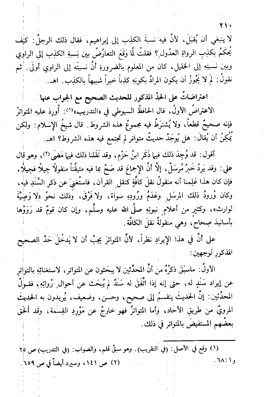 الِاعْتِرَاض الأول قَالَ الْحَافِظ السُّيُوطِيّ فِي التدريب أورد عَلَيْهِ التَّوَاتُر فَإِنَّهُ صَحِيح قطعا وَلَا يشْتَرط فِيهِ مَجْمُوع من الشُّرُوط قَالَ شيخ الْإِسْلَام وَلَكِن يُمكن أَن يُقَال هَل يُوجد حَدِيث متواتر لم تَجْتَمِع فِيهِ هَذِه الشُّرُوط اهـ