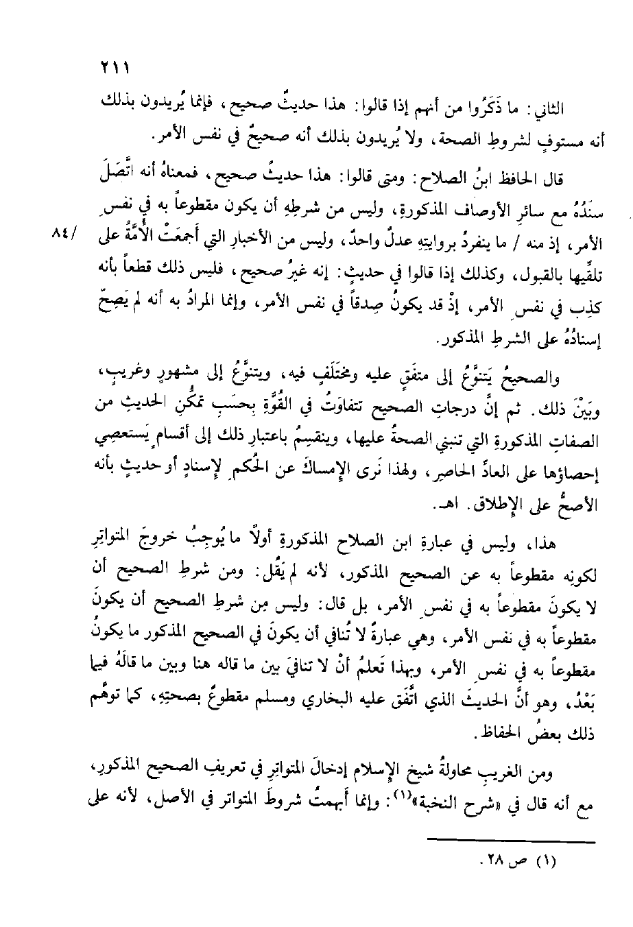 هَذَا وَلَيْسَ فِي عبارَة ابْن الصّلاح الْمَذْكُور أَولا مَا يُوجب خُرُوج الْمُتَوَاتر لكَونه مَقْطُوعًا بِهِ عَن الصَّحِيح الْمَذْكُور لِأَنَّهُ لم يقل وَمن شَرط الصَّحِيح أَن لَا يكون مَقْطُوعًا بِهِ فِي نفس الْأَمر بل قَالَ وَلَيْسَ من شَرط الصَّحِيح أَن يكون مَقْطُوعًا بِهِ فِي نفس الْأَمر وَهِي عبارَة لَا تنَافِي أَن يكون فِي الصَّحِيح الْمَذْكُور مَا يكون مَقْطُوعًا بِهِ فِي نفس الْأَمر وَبِهَذَا تعلم أَن لَا تنَافِي بَين مَا قَالَه هُنَا وَبَين مَا قَالَه فِيمَا بعد وَهُوَ أَن الحَدِيث الَّذِي اتّفق عَلَيْهِ البُخَارِيّ وَمُسلم مَقْطُوع بِصِحَّتِهِ مَا توهم ذَلِك بعض الْحفاظ