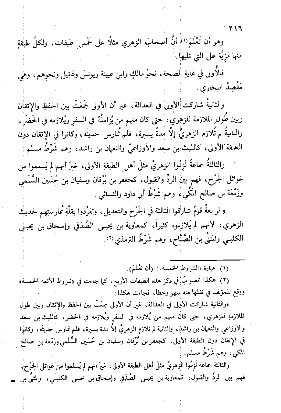 وَالثَّانيَِة شاركت الأولى فِي الْعَدَالَة غير أَن الأولى جمعت بَين الْحِفْظ والإتقان وَبَين طول الْمُلَازمَة لِلزهْرِيِّ حَتَّى كَانَ مِنْهُم من يزامله فِي السّفر ويلازمه فِي الْحَضَر وَالثَّانيَِة لم تلازم الزُّهْرِيّ إِلَّا مُدَّة يسيرَة فَلم تمارس حَدِيثه وَكَانُوا فِي الإتقان دون الطَّبَقَة الأولى كالليث بن سعد وَالْأَوْزَاعِيّ والنعمان بن رَاشد وَهُوَ شَرط مُسلم وَالثَّالِثَة لزموا الزُّهْرِيّ مثل أهل الطَّبَقَة الأولى غير أَنهم لم يسلمُوا من غوائل الْجرْح فهم بَين الرَّد وَالْقَبُول كجعفر بن برْقَان وسُفْيَان بن حُسَيْن السّلمِيّ وَزَمعَة بن صَالح الْمَكِّيّ وهم شَرط أبي دَاوُد وَالنَّسَائِيّ