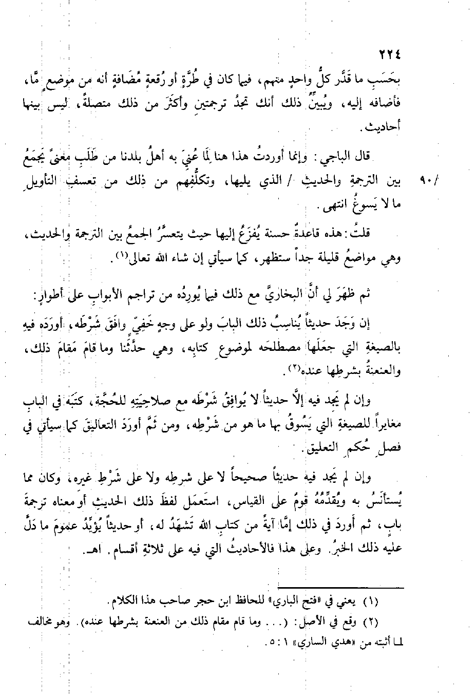 وَإِن لم يجد فِيهِ حَدِيثا صَحِيحا لَا على شَرط غَيره وَكَانَ مِمَّا يسْتَأْنس بِهِ ويقدمه قوم على الْقيَاس اسْتعْمل لفظ ذَلِك الحَدِيث أَو مَعْنَاهُ تَرْجَمَة بَاب ثمَّ أورد فِي ذَلِك إِمَّا آيَة من كتاب الله تشهد لَهُ أَو حَدِيثا يُؤَيّد عُمُوم م دلّ عَلَيْهِ ذَلِك الْخَبَر وعَلى هَذَا فالأحاديث الَّتِي فِيهِ على ثَلَاثَة أَقسَام اهـ