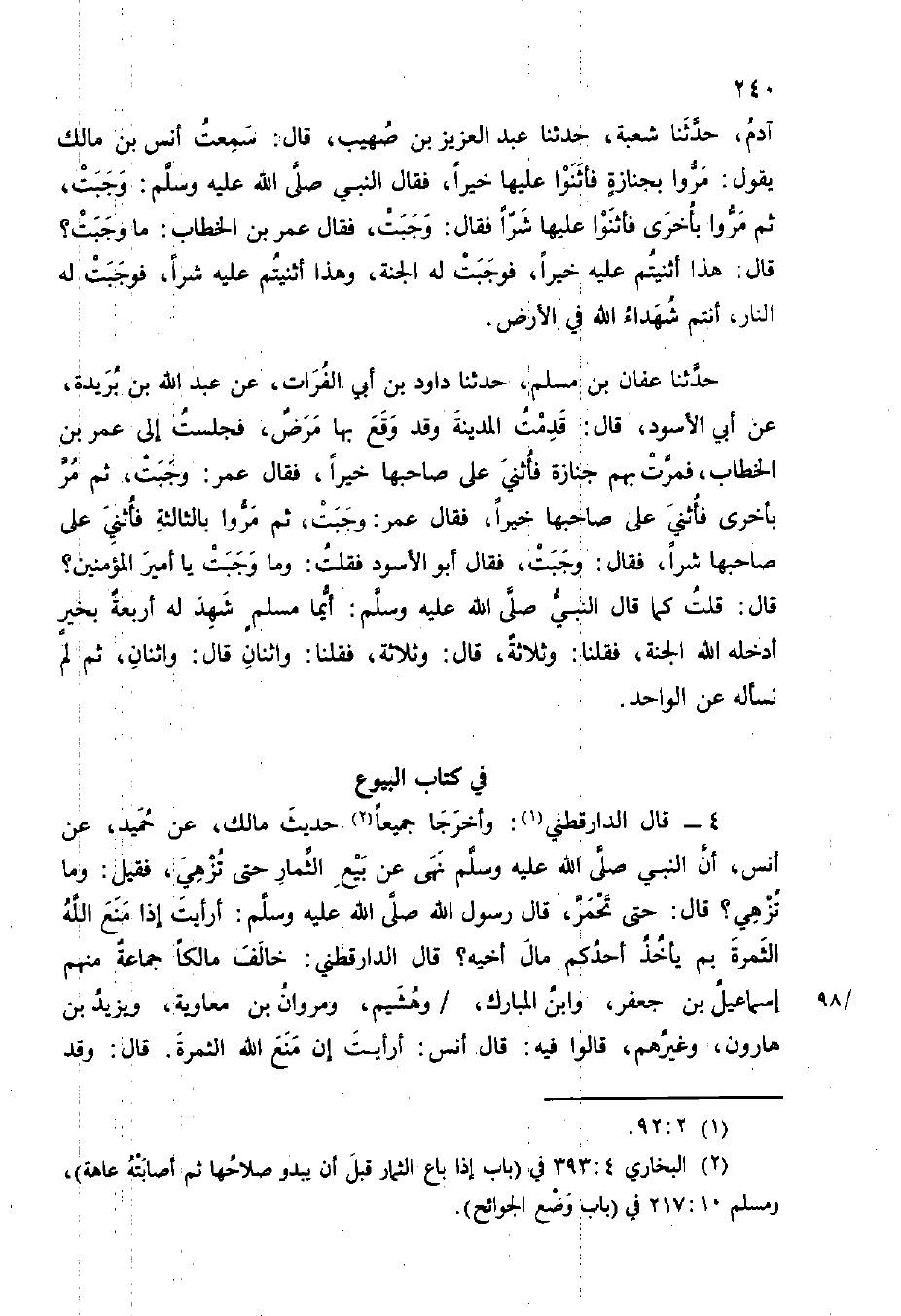 4 - قَالَ الدَّارَقُطْنِيّ وَأَخْرَجَا جَمِيعًا حَدِيث مَالك عَن حميد عَن أنس أَن النَّبِي صلى الله عَلَيْهِ وَسلم نهى عَن بيع الثِّمَار حَتَّى تزهى فَقيل وَمَا تزهى قَالَ حَتَّى تحمر قَالَ رَسُول الله صلى الله عَلَيْهِ وَسلم أَرَأَيْت إِذا منع الله الثَّمَرَة بِمَ يَأْخُذ أحدكُم مَال أَخِيه قَالَ الدَّارَقُطْنِيّ خَالف مَالِكًا جمَاعَة مِنْهُم إِسْمَاعِيل بن جَعْفَر وَابْن الْمُبَارك وهشيم ومروان بن ماوية وَيزِيد بن هَارُون وَغَيرهم قَالُوا فِيهِ قَالَ أنس أَرَأَيْت إِن منع الله الثَّمَرَة قَالَ وَقد