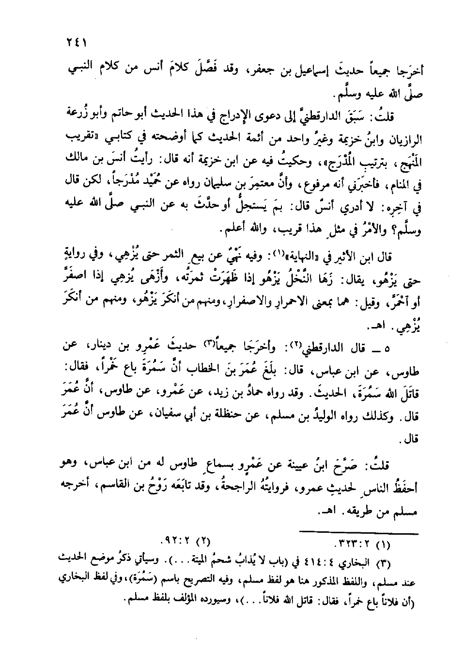 قلت سبق الدَّارَقُطْنِيّ إِلَى دَعْوَى الإدراج فِي هَذَا الحَدِيث أَبُو حَاتِم وَأَبُو زرْعَة الرازيان وَابْن خُزَيْمَة وَغير وَاحِد من أَئِمَّة الحَدِيث كَمَا أوضحته فِي كتابي تقريب الْمنْهَج بترتيب المدرج وحكيت فِيهِ عَن ابْن خُزَيْمَة أَنه قَالَ رَأَيْت أنس بن مَالك فِي الْمَنَام فَأَخْبرنِي أَنه مَرْفُوع وَأَن مُعْتَمر بن سُلَيْمَان رَوَاهُ عَن حميد مدرجا لَكِن قَالَ فِي آخِره لَا أَدْرِي أنس قَالَ بِمَ يسْتَحل أَو حدث بِهِ عَن النَّبِي صلى الله عَلَيْهِ وَسلم وَالْأَمر فِي مثل هَذَا قريب وَالله اعْلَم