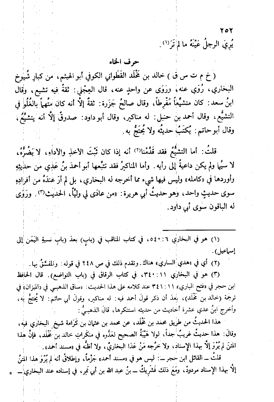قلت أما التَّشَيُّع فقد قدمنَا أَنه إِذا كَانَ ثَبت الْأَخْذ وَالْأَدَاء لَا يضرّهُ لَا سِيمَا وَلم يكن دَاعِيَة إِلَى رَأْيه وَأما الْمَنَاكِير فقد تتبعها أَبُو أَحْمد بن عدي من حَدِيثه وأوردها فِي كَامِله وَلَيْسَ فِيهَا شَيْء مِمَّا أخرجه لَهُ البُخَارِيّ بل لم أر عِنْده من أَفْرَاده سوى حَدِيث وَاحِد وَهُوَ حَدِيث أبي هُرَيْرَة من عادى لي وليا الحَدِيث وروى لَهُ الْبَاقُونَ سوى أبي دَاوُد