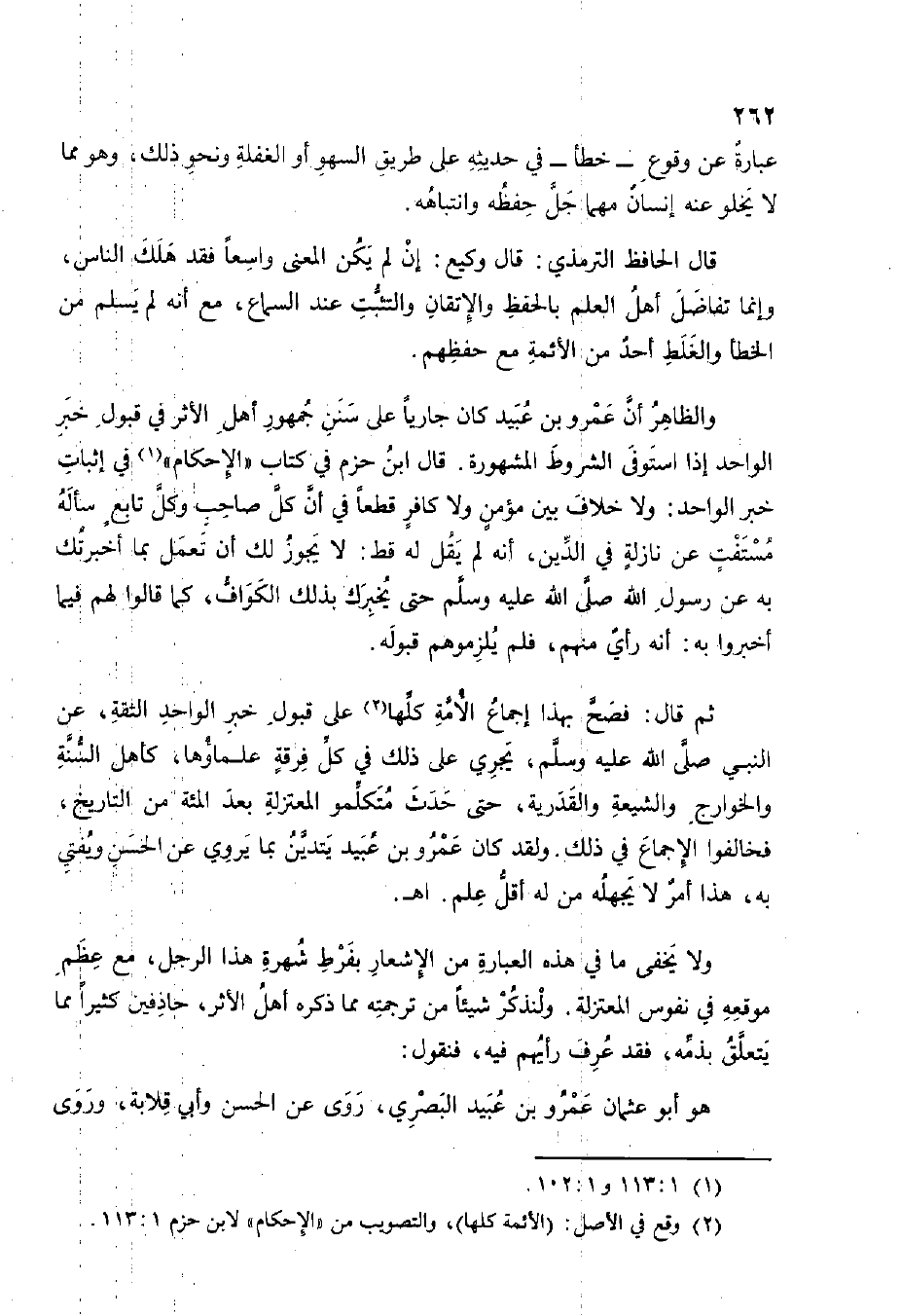 ثمَّ قَالَ فصح بِهَذَا إِجْمَاع الْأمة كلهَا على قبُول خبر الْوَاحِد الثِّقَة عَن النَّبِي صلى الله عَلَيْهِ وَسلم يجْرِي على ذَلِك فِي كل فرقة علماؤها كَاهِل السّنة والخوارج والشيعة والقدرية حَتَّى حدث متكلموا الْمُعْتَزلَة بعد المئة من التَّارِيخ فخالفوا الْإِجْمَاع فِي ذَلِك وَلَقَد كَانَ عَمْرو بن عبيد يتدين بِمَا يروي عَن الْحسن ويفتي بِهِ هَذَا أَمر لَا يجهله من لَهُ أقل علم اهـ