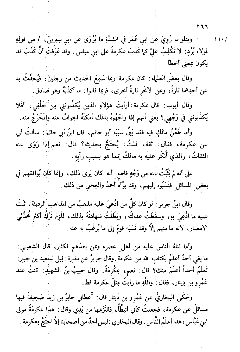 وَحكى البُخَارِيّ عَن عَمْرو بن دِينَار قَالَ أَعْطَانِي جَابر بن زيد صحيفَة فِيهَا مسَائِل عَن عِكْرِمَة فَجعلت كَأَنِّي أتبطأ فانتزعها من يَدي وَقَالَ هَذَا عِكْرِمَة مولى ابْن عَبَّاس هَذَا أعلم النَّاس وَقَالَ البُخَارِيّ لَيْسَ أحد من أَصْحَابنَا إِلَّا احْتج بِعِكْرِمَةَ