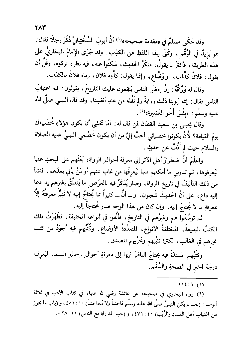 وَقَالَ لَهُ وراقة إِن بعض النَّاس ينقمون عَلَيْك التَّارِيخ يَقُولُونَ فِيهِ اغتياب النَّاس فَقَالَ إِنَّمَا روينَا ذَلِك رِوَايَة وَلم نَقله من عِنْد أَنْفُسنَا وَقد قَالَ النَّبِي صلى الله عَلَيْهِ وَسلم بئس أَخُو الْعَشِيرَة وَقَالَ يحيى بن سعيد الْقطَّان لمن قَالَ لَهُ أما تخشى أَن يكون هَؤُلَاءِ خصماءك يَوْم الْقِيَامَة لِأَن يَكُونُوا خصمائي أحب إِلَيّ أَن يكون خصمي النَّبِي عَلَيْهِ الصَّلَاة وَالسَّلَام حَيْثُ لم أذب عَن حَدِيثه