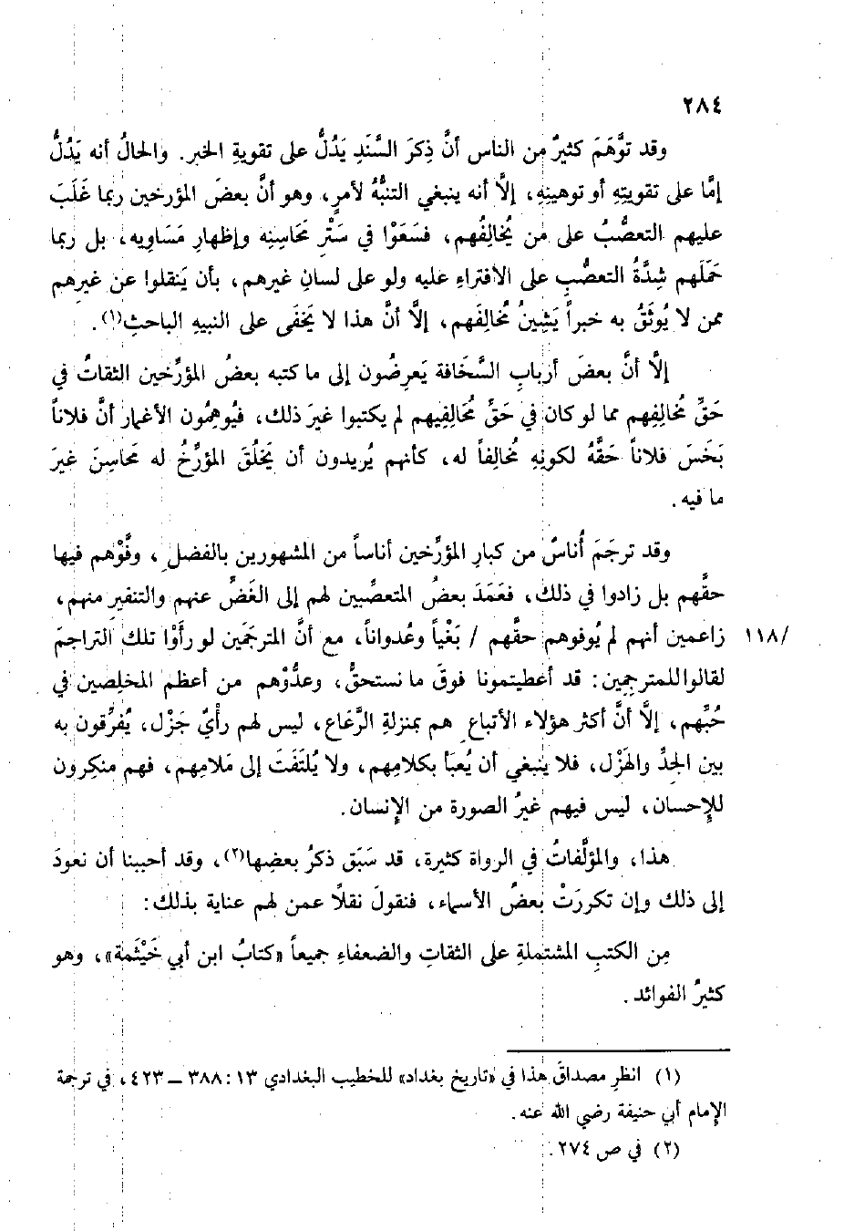 وَقد توهم كثير من النَّاس أَن ذكر السَّنَد يدل على تَقْوِيَة الْخَبَر وَالْحَال أَنه يدل إِمَّا على تقويته أَو توهِينه إِلَّا أَنه يَنْبَغِي التنبه لأمر وَهُوَ ان بعض المؤرخين رُبمَا غلب عَلَيْهِم التعصب على من يخالفهم فسعوا فِي ستر محاسنه بِأَن ينقلوا عَن غَيرهم حملهمْ شدَّة التعصب على الافتراء عَلَيْهِ وَلَو كَانَ على لِسَان غَيرهم بِأَن ينقلوا عَن غَيرهم مِمَّن لَا يوثق بِهِ خَبرا يشين خالفهم إِلَّا ان هَذَا لَا يخفى على النبيه الباحث