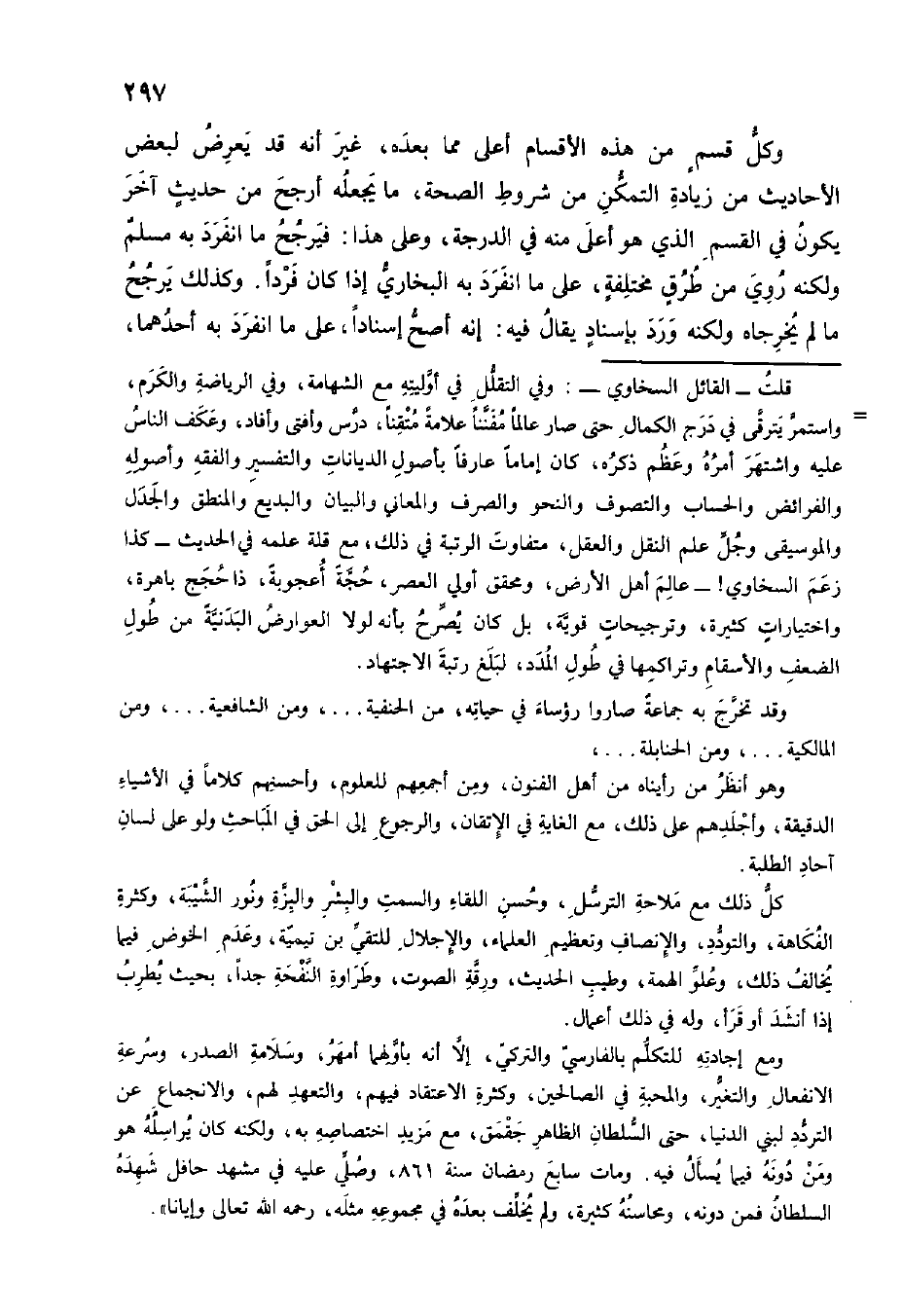 وكل قسم من هَذِه الْأَقْسَام أَعلَى مِمَّا بعده غير أَنه قد يعرض لبَعض الْأَحَادِيث من زِيَادَة التَّمَكُّن من شُرُوط الصِّحَّة مَا يَجعله أرجح من حَدِيث آخر يكون فِي الْقسم الَّذِي هُوَ أَعلَى مِنْهُ فِي الدرجَة وعَلى هَذَا فيرجح مَا انْفَرد بِهِ مُسلم وَلكنه رُوِيَ من طرق مُخْتَلفَة على مَا انْفَرد بِهِ البُخَارِيّ إِذا كَانَ فَردا وَكَذَلِكَ يرجح مَا لم يخرجَاهُ وَلكنه ورد بِإِسْنَاد يُقَال فِيهِ إِنَّه أصح إِسْنَادًا على مَا انْفَرد بِهِ أَحدهمَا
