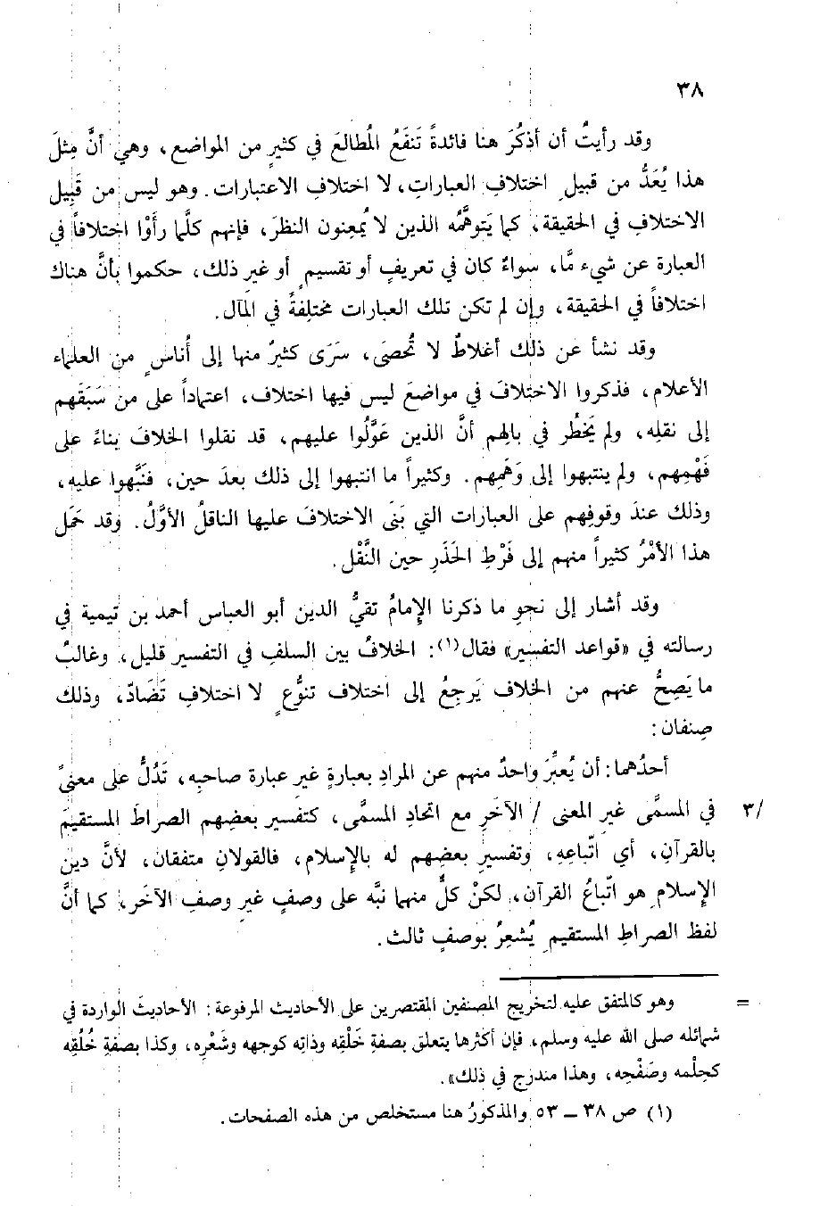 وَقد أَشَارَ إِلَى نَحْو مَا ذكرنَا الإِمَام تَقِيّ الدّين أَبُو الْعَبَّاس أَحْمد بن تَيْمِية فِي رسَالَته فِي قَوَاعِد التَّفْسِير فَقَالَ الْخلاف بَين السّلف فِي التَّفْسِير قَلِيل وغالب مَا يَصح عَنْهُم من الْخلاف يرجع إِلَى اخْتِلَاف تنوع لَا اخْتِلَاف تضَاد وَذَلِكَ صنفان