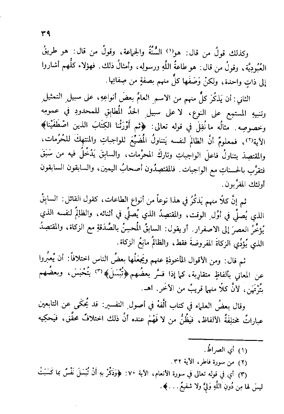 الثَّانِي أَن يذكر كل مِنْهُم من الِاسْم الْعَام بعض أَنْوَاعه على سَبِيل التَّمْثِيل وتنبيه المستمع على النَّوْع لَا على سَبِيل الْحَد المطابق للمحدود فِي عُمُومه وخصوصه مِثَاله مَا نقل فِي قَوْله تَعَالَى {ثمَّ أَوْرَثنَا الْكتاب الَّذين اصْطَفَيْنَا} الْآيَة فمعلوم أَن الظَّالِم لنَفسِهِ يتَنَاوَل المضيع للواجبات والمنتهك للحرمات والمقتصد يتَنَاوَل فَاعل الْوَاجِبَات وتارك الْمُحرمَات وَالسَّابِق يدْخل فِيهِ من سبق فتقرب بِالْحَسَنَاتِ مَعَ الْوَاجِبَات فالمقتصدون أَصْحَاب الْيَمين وَالسَّابِقُونَ السَّابِقُونَ أُولَئِكَ المقربون
