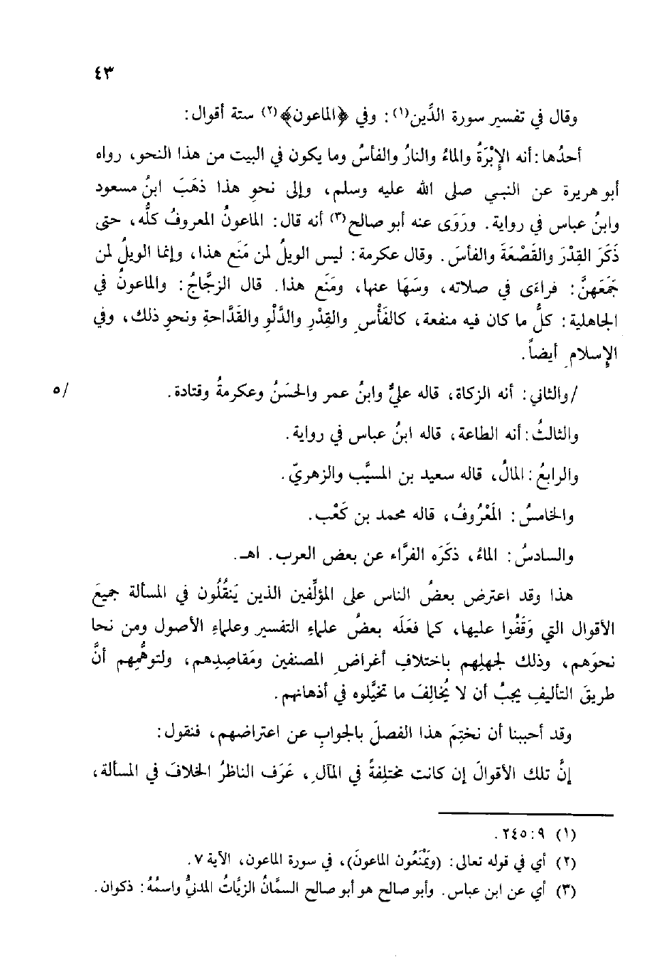 وَقَالَ فِي تَفْسِير سُورَة الدّين وَفِي {الماعون} سِتَّة أَقْوَال