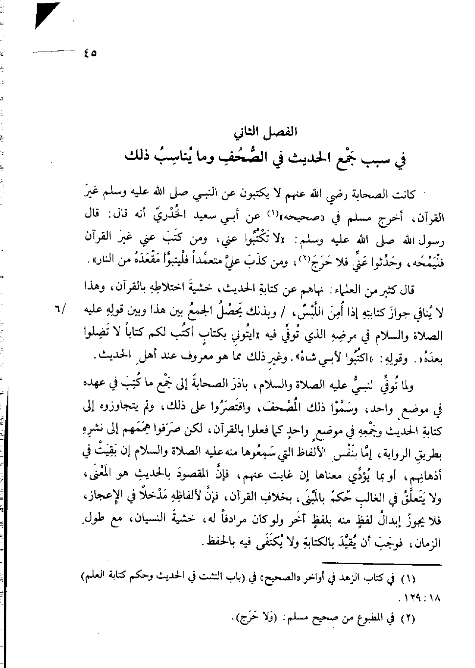 كَانَت الصَّحَابَة رَضِي الله عَنْهُم لَا يَكْتُبُونَ عَن النَّبِي صلى الله عَلَيْهِ وَسلم غير الْقُرْآن أخرج مُسلم فِي صَحِيحه عَن أبي سعيد الْخُدْرِيّ أَنه قَالَ قَالَ رَسُول الله صلى الله عَلَيْهِ وَسلم لَا تكْتبُوا عني وَمن كتب عني غير الْقُرْآن فليمحه وَحَدثُوا عني فَلَا حرج وَمن كذب عَليّ مُتَعَمدا فَليَتَبَوَّأ مَقْعَده من النَّار
