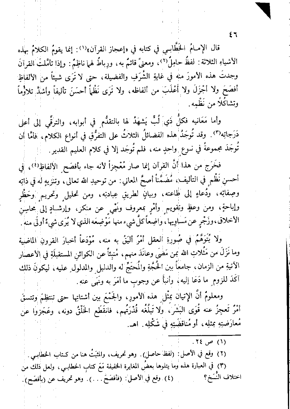 قَالَ الإِمَام الْخطابِيّ فِي كِتَابه فِي إعجاز الْقُرْآن إِنَّمَا يقوم الْكَلَام بِهَذِهِ الْأَشْيَاء الثَّلَاثَة لفظ حَامِل وَمعنى قَائِم بِهِ ورباط لَهما ناظم وَإِذا تَأَمَّلت الْقُرْآن وجدت هَذِه الْأُمُور مِنْهُ فِي غَايَة الشّرف والفضيلة حَتَّى لَا ترى شَيْئا من الْأَلْفَاظ أفْصح وَلَا أجزل وَلَا أعذب من أَلْفَاظه وَلَا ترى نظما أحسن تأليفا وَأَشد تلاؤما وتشاكلا من نظمه