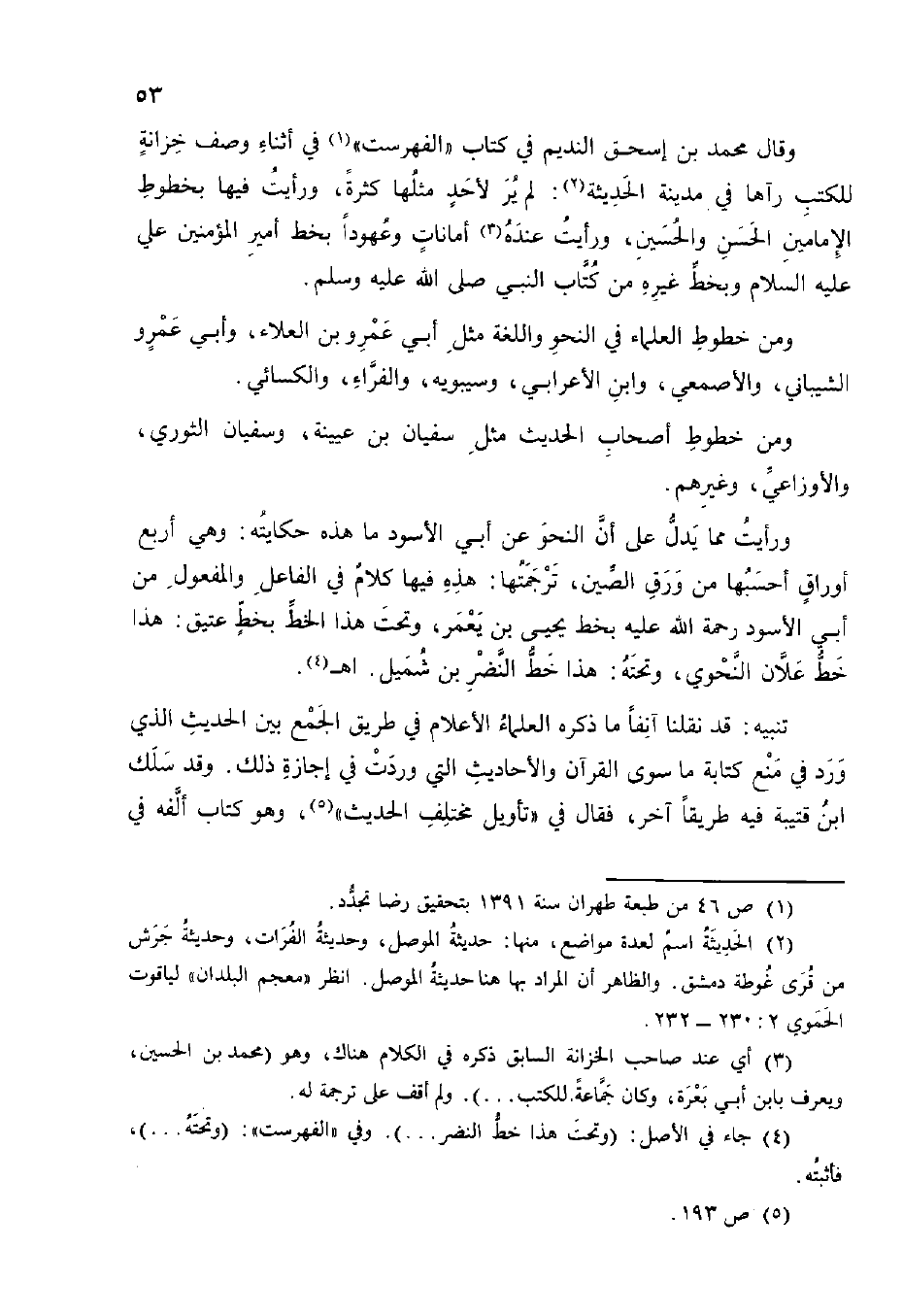 وَقَالَ مُحَمَّد بن إِسْحَاق النديم فِي كتاب الفهرست فِي أثْنَاء وصف خزانَة للكتب رَآهَا فِي مَدِينَة الحديثة لم ير لأحد مثلهَا كَثْرَة وَرَأَيْت فِيهَا بخطوط الْإِمَامَيْنِ الْحسن وَالْحُسَيْن وَرَأَيْت عِنْده أمانات وعهودا بِخَط أَمِير الْمُؤمنِينَ عَليّ عَلَيْهِ السَّلَام وبخط غَيره من كتاب النَّبِي صلى الله عَلَيْهِ وَسلم
