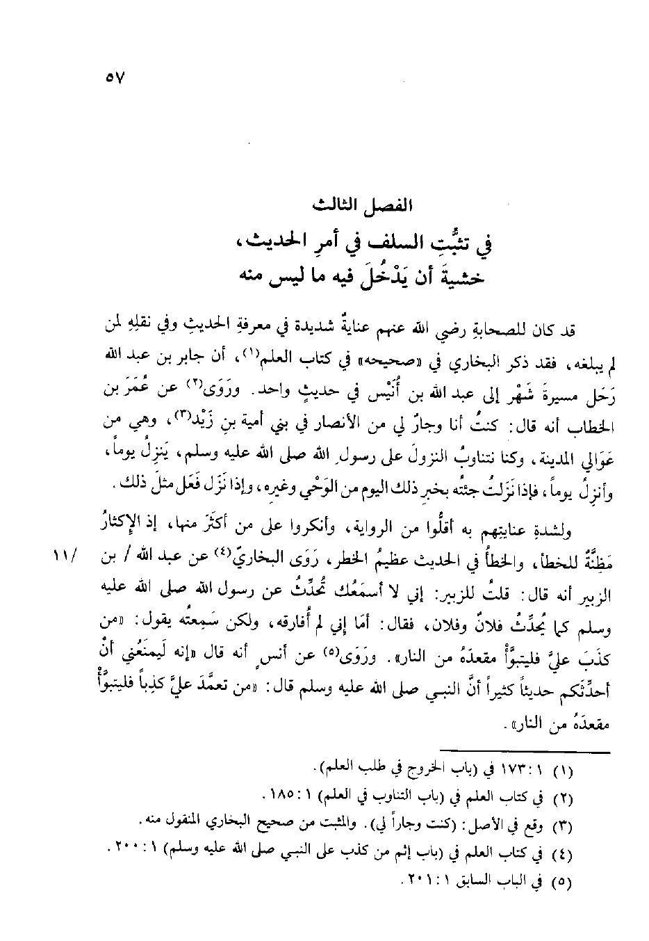 ولشدة عنايتهم بِهِ أقلوا من الرِّوَايَة وأنكروا على من أَكثر مِنْهَا إِذْ الْإِكْثَار مَظَنَّة للخطأ وَالْخَطَأ فِي الحَدِيث عَظِيم الْخطر روى البُخَارِيّ عَن عبد الله بن الزبير أَنه قَالَ قلت للزبير إِنِّي لَا أسمعك تحدث عَن رَسُول الله صلى الله عَلَيْهِ وَسلم كَمَا يحدث فلَان وَفُلَان فَقَالَ أما إِنِّي لم أفارقه وَلَكِن سمعته يَقُول من كذب عَليّ فَليَتَبَوَّأ مَقْعَده من النَّار وروى عَن أنس أَنه قَالَ إِنَّه ليمنعني أَن أحدثكُم حَدِيثا أَن النَّبِي صلى الله عَلَيْهِ وَسلم قَالَ من تعمد عَليّ كذبا فَليَتَبَوَّأ مَقْعَده من النَّار