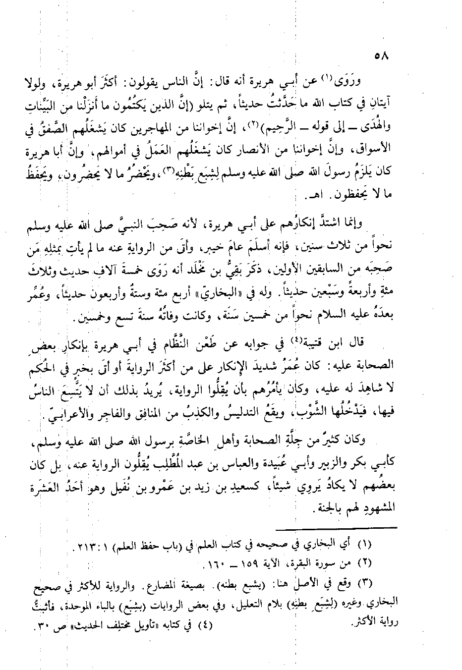 قَالَ ابْن قُتَيْبَة فِي جَوَابه عَن طعن النظام فِي أبي هُرَيْرَة بإنكار بعض الصَّحَابَة عَلَيْهِ كَانَ عمر شَدِيد الْإِنْكَار على من أَكثر الرِّوَايَة أَو أَتَى بِخَبَر فِي الحكم لَا شَاهد لَهُ عَلَيْهِ وَكَانَ يَأْمُرهُم بِأَن يقلوا الرِّوَايَة يُرِيد بذلك أَن لَا يَتَّسِع النَّاس فِيهَا فيدخلها الشوب وَيَقَع التَّدْلِيس وَالْكذب من الْمُنَافِق والفاجر والأعرابي