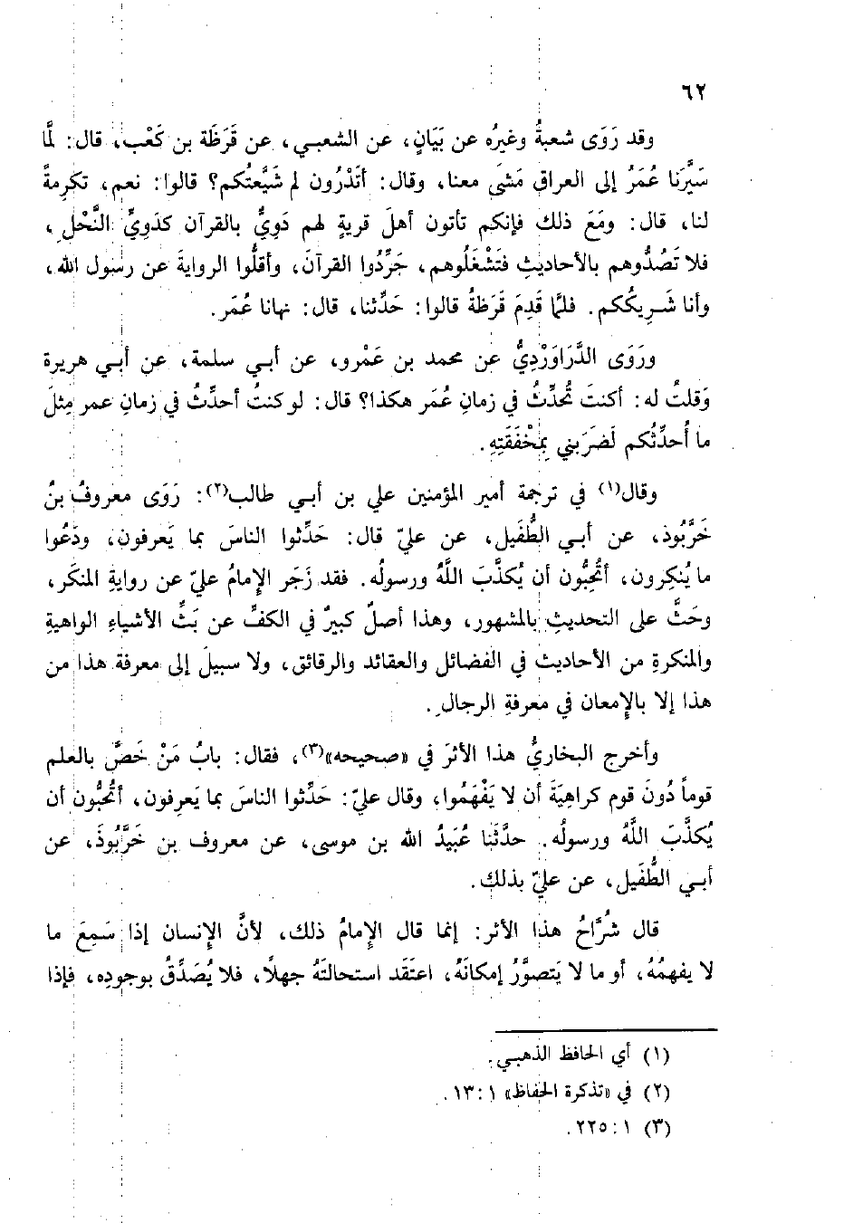 وَقَالَ فِي تَرْجَمَة أَمِير الْمُؤمنِينَ عَليّ بن أبي طَالب روى مَعْرُوف بن خَرَّبُوذ عَن أبي الطُّفَيْل عَن عَليّ قَالَ حدثوا النَّاس بِمَا يعْرفُونَ ودعوا مَا ينكون أتحبون أَن يكذب الله وَرَسُوله فقد زجر الإِمَام عَليّ عَن رِوَايَة الْمُنكر وحث على التحديث بالمشهور وَهَذَا أصل كَبِير فِي الْكَفّ عَن بَث الْأَشْيَاء الْوَاهِيَة والمنكرة من الْأَحَادِيث فِي الْفَضَائِل والعقائد وَالرَّقَائِق وَلَا سَبِيل إِلَى معرفَة هَذَا من هَذَا إِلَّا بالإمعان فِي معرفَة الرِّجَال