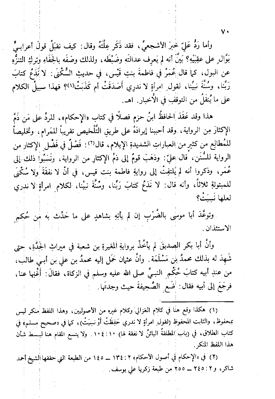 هَذَا وَقد عقد الْحَافِظ ابْن حزم فصلا فِي كتاب الإحكام للرَّدّ على من ذمّ الْإِكْثَار من الرِّوَايَة وَقد أحببنا إِيرَاده على طَرِيق التَّلْخِيص تَقْرِيبًا للمرام وتخليصا للمطالع من كثير من الْعبارَات الشَّدِيدَة الإيلام قَالَ فصل فِي فضل الْإِكْثَار من الرِّوَايَة للسنن قَالَ عَليّ وَذهب قوم إِلَى ذمّ الْإِكْثَار من الرِّوَايَة ونسبوا ذَلِك إِلَى عمر وَذكروا أَنه لم يلْتَفت إِلَى رِوَايَة فَاطِمَة بنت قيس فِي أَن لَا نَفَقَة وَلَا سُكْنى للمبتوتة ثَلَاثًا وَأَنه قَالَ لَا نَدع كتاب رَبنَا وَسنة نَبينَا لكَلَام امْرَأَة لَا نَدْرِي لَعَلَّهَا نسيت