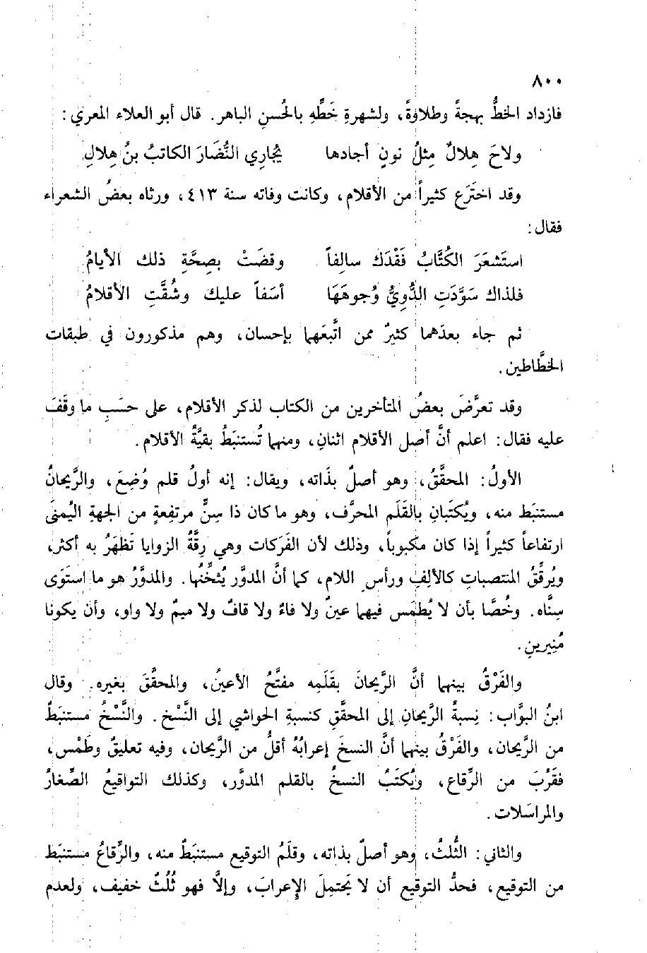 والنسخ مستنبط من الريحان وَالْفرق بَينهمَا أَن النّسخ إعرابه أقل من الريحان وَفِيه تَعْلِيق وطمس فَقرب من الرّقاع وَيكْتب النّسخ بالقلم المدور وَكَذَلِكَ التواقيع الصغار والمراسلات