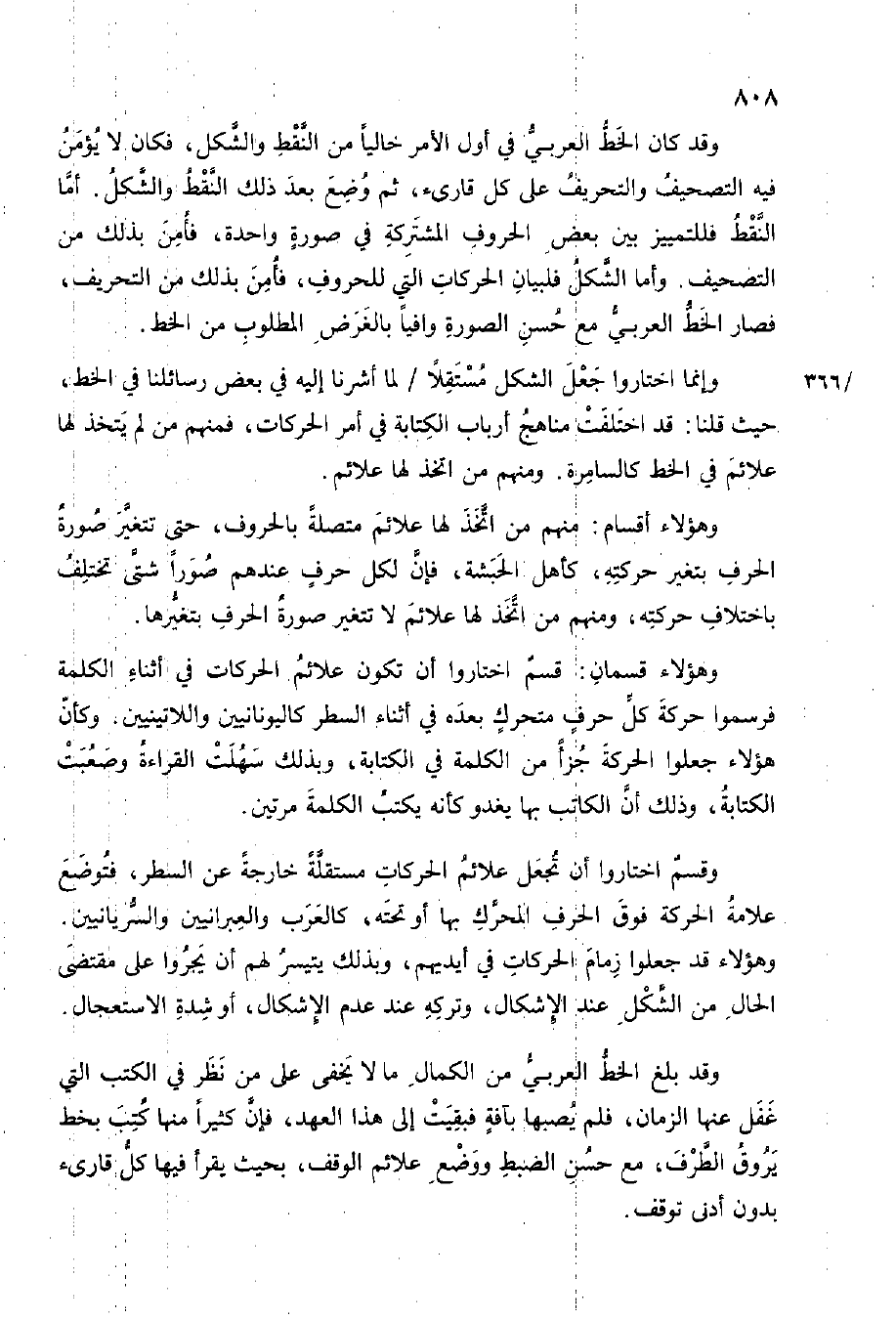 وَقد بلغ الْخط الْعَرَبِيّ من الْكَمَال مَا لَا يخفى على من نظر فِي الْكتب الَّتِي غفل عَنْهَا الزَّمَان فَلم يصبهَا بِآفَة فَبَقيت إِلَى هَذَا الْعَهْد فَإِن كثيرا مِنْهَا كتب بِخَط يروق الطّرف مَعَ حسن الضَّبْط وَوضع علائم الْوَقْف بِحَيْثُ يقْرَأ فِيهَا كل قَارِئ بِدُونِ أدنى توقف