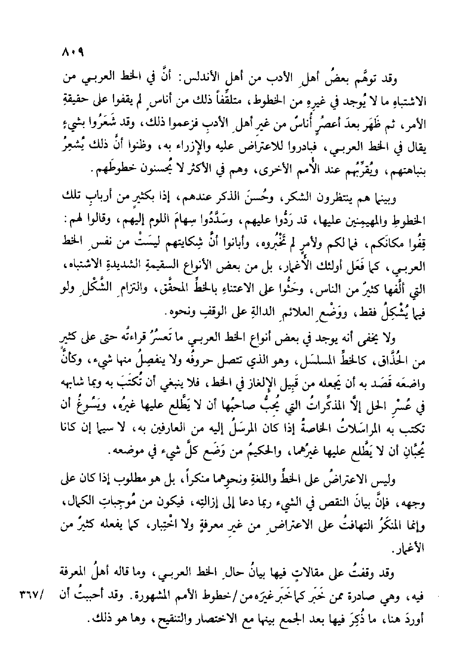 وَقد توهم بعض أهل الْأَدَب من أهل الأندلس أَن فِي الْخط الْعَرَبِيّ من الْأَشْيَاء مَا لَا يُوجد فِي غَيره من الخطوط متلقفا ذَلِك من أنَاس لم يقفوا على حَقِيقَة الْأَمر ثمَّ ظهر بعد أعصر أنَاس من غير أهل الْأَدَب فزعموا ذَلِك وَقد شعروا بِشَيْء يُقَال فِي الْخط الْعَرَبِيّ فبادروا للاعتراض عَلَيْهِ والإزراء بِهِ وظنوا أَن ذَلِك يشْعر بنباهتهم ويقربهم عِنْد الْأُمَم الْأُخْرَى وهم فِي الْأَكْثَر لَا يحسنون خطوطهم