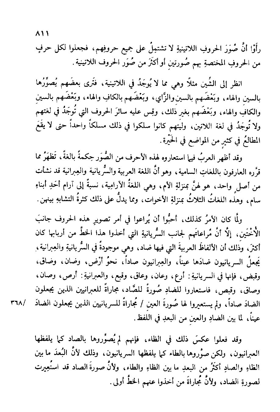وَلما كَانَ الْأَمر كَذَلِك أَحبُّوا أَن يراعوا فِي أَمر تَصْوِير هَذِه الْحُرُوف جَانب الْأُخْتَيْنِ إِلَّا أَن مُرَاعَاتهمْ لجَانب السريانية الَّتِي أخذُوا هَذَا الْخط من أَرْبَابهَا كَانَ أَكثر وَذَلِكَ أَن الْأَلْفَاظ الْعَرَبيَّة الَّتِي فِيهَا صَاد وَهِي مَوْجُودَة فِي السريانية والعبرانية تجْعَل السريانيون ضادها عينا والعبرانيون صادا نَحْو أَرض وضان وضاق وَقبض فَإِنَّهَا فِي السريانية أرع وعان وعاق وقبع والعبرانية أرص وصان وصاق وقبص فاستعاروا للضاد صُورَة للصاد مجاراة للعبرانيين الَّذين يجْعَلُونَ الضَّاد صادا وَلم يستعيروا لَهَا صُورَة الْعين مجاراة للسريانيين الَّذين يجْعَلُونَ الضَّاد عينا لما بَين الضَّاد وَالْعين من الْبعد فِي اللَّفْظ