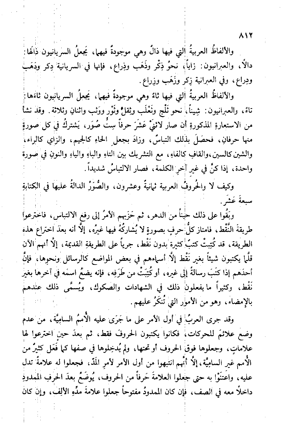 وَقد نَشأ من الِاسْتِعَارَة الْمَذْكُورَة أَن صَار لاثني عشر حرفا سِتّ صور يشْتَرك فِي كل صُورَة مِنْهَا حرفان فَحصل بذلك التباس وَزَاد بِجعْل الْحَاء كالجيم وَالزَّاي كالراء والشين كالسين وَالْقَاف كالفاء مَعَ التَّشْرِيك بَين التَّاء وَالْبَاء وَالْيَاء وَالنُّون فِي صُورَة وَاحِدَة إِذا كن فِي غير آخر الْكَلِمَة فَصَارَ الالتباس شَدِيدا