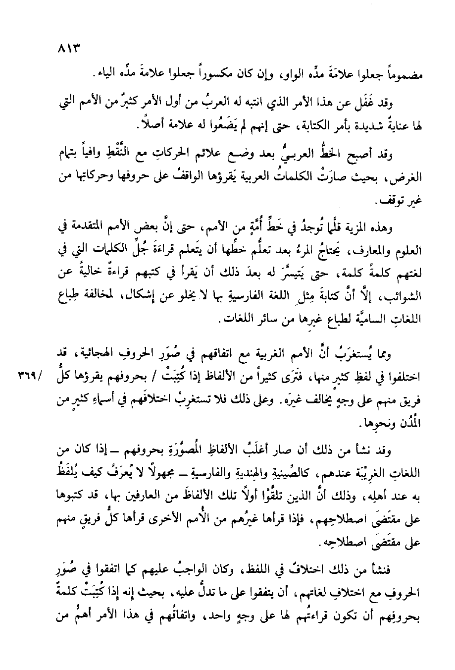وَهَذِه المزية قَلما تُوجد فِي خطّ أمة من الْأُمَم حَتَّى إِن بعض الْأُمَم الْمُتَقَدّمَة فِي الْعُلُوم والمعارف يحْتَاج الْمَرْء بعد تعلم خطها أَن يتَعَلَّم قِرَاءَة جلّ الْكَلِمَات الَّتِي فِي لغتهم كلمة كلمة حَتَّى يَتَيَسَّر لَهُ بعد ذَلِك أَن يقْرَأ فِي كتبهمْ قِرَاءَة خَالِيَة من الشوائب إِلَّا أَن كِتَابَة مثل اللُّغَة الفارسية بهَا لَا يَخْلُو من إِشْكَال لمُخَالفَة طباع اللُّغَات السامية لطباع غَيرهَا من سَائِر اللُّغَات