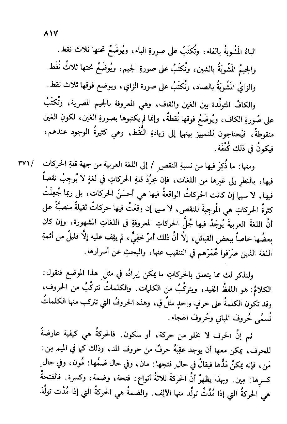 وَمِنْهَا مَا ذكر فِيهَا من نِسْبَة النَّقْص إِلَى اللُّغَة الْعَرَبيَّة من جِهَة قلَّة الحركات فِيهَا بِالنّظرِ إِلَى غَيرهَا من اللُّغَات فَإِن مُجَرّد قلَّة الحركات فِي لُغَة لَا يُوجب نقصا فِيهَا لَا سِيمَا إِن كَانَت الحركات الْوَاقِعَة فِيهَا هِيَ أحسن الحركات بل رُبمَا جعلت كَثْرَة الحركات هِيَ الْمُوجبَة للنقص لَا سِيمَا إِن وَقعت فِيهَا حركات ثَقيلَة منصبة على أَن اللُّغَة الْعَرَبيَّة يُوجد فِيهَا جلّ الحركات الْمَعْرُوفَة فِي اللُّغَات الْمَشْهُورَة وَإِن كَانَ بَعْضهَا خَاصّا بِبَعْض الْقَبَائِل إِلَّا أَن ذَلِك أَمر خَفِي لم يقف عَلَيْهِ إِلَّا قَلِيل من أَئِمَّة اللُّغَة الَّذين صرفُوا عمرهم فِي التنقيب عَنْهَا والبحث فِي أسرارها