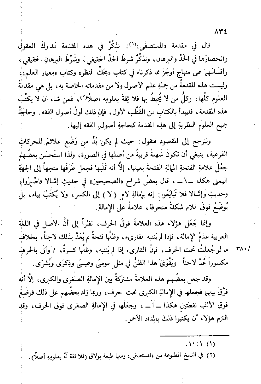 قَالَ فِي مُقَدّمَة الْمُسْتَصْفى نذْكر فِي هَذِه الْمُقدمَة مدارك الْعُقُول وانحصارها فِي الْحَد والبرهان وَنَذْكُر شَرط الْحَد الْحَقِيقِيّ وَشرط الْبُرْهَان الْحَقِيقِيّ وأقسامهما على منهاج أوجز مِمَّا ذَكرْنَاهُ فِي كتاب محك النّظر وَكتاب معيار الْعلم وَلَيْسَت هَذِه الْمُقدمَة من جملَة علم الْأُصُول وَلَا من مقدماته الْخَاصَّة بِهِ بل هِيَ مُقَدّمَة الْعُلُوم كلهَا وكل من لَا يُحِيط بهَا فَلَا ثِقَة بِعُلُومِهِ أصلا فَمن شَاءَ أَن لَا يكْتب هَذِه الْمُقدمَة فليبدأ بِالْكتاب من القطب الأول فَإِن ذَلِك أول أصُول الْفِقْه