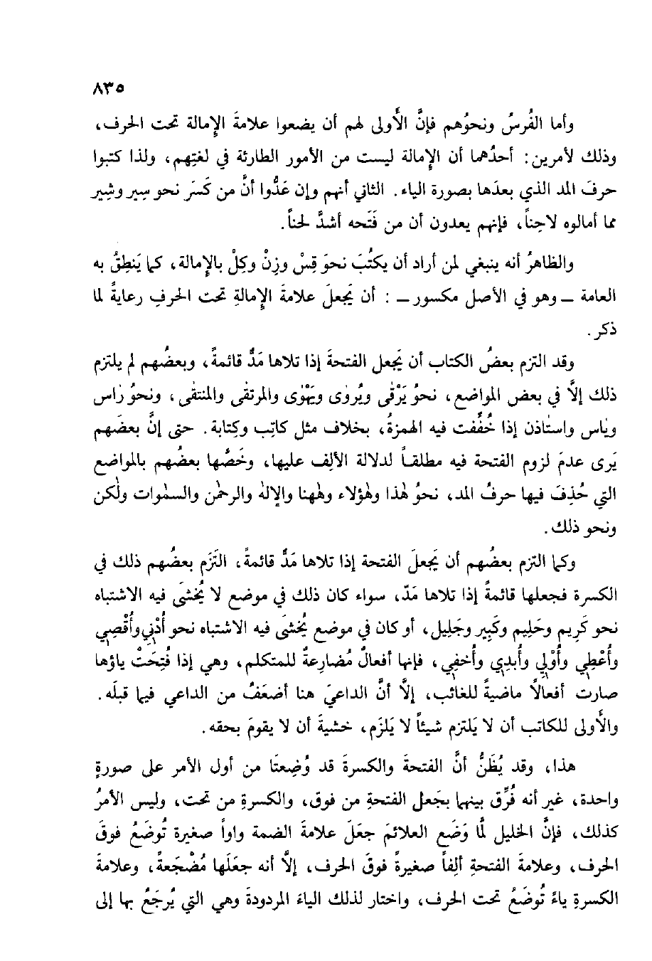 وكما الْتزم بَعضهم أَن يَجْعَل الفتحة إِذا تَلَاهَا مد قَائِمَة الْتزم بَعضهم ذَلِك فِي الكسرة فَجَعلهَا قَائِمَة إِذا تَلَاهَا مد سَوَاء كَانَ ذَلِك فِي مَوَاضِع لَا يخْشَى فِيهِ الِاشْتِبَاه نَحْو كريم وحليم وكبير وجليل أَو كَانَ فِي مَوَاضِع يخْشَى فِيهِ الِاشْتِبَاه نَحْو أدنى وأقصى وَأعْطى وأولي وأبدي وأخفي فَإِنَّهَا أَفعَال مضارعة للمتكلم وَهِي إِذا فتحت ياؤها صَارَت أفعالا مَاضِيَة للْغَائِب إِلَّا أَن الدَّاعِي هُنَا أَضْعَف من الدَّاعِي فِيمَا قبله وَالْأولَى لِلْكَاتِبِ أَن لَا يلْتَزم خشيَة أَن لَا يقوم بِحقِّهِ