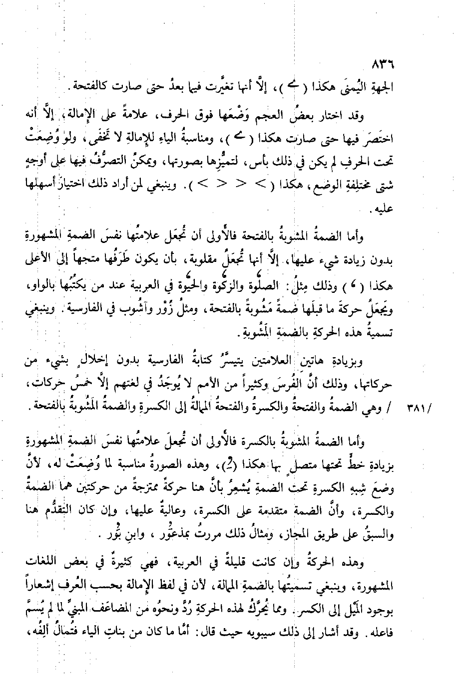 أما الضمة المشوبة بالفتحة فَالْأولى أَن تجْعَل علامتها نفس الضمة الْمَشْهُورَة بِدُونِ زِيَادَة شَيْء عَلَيْهَا إِلَّا أَنَّهَا تجْعَل مَقْلُوبَة بِأَن يكون طرفها متجها إِلَى الْأَعْلَى هَكَذَا وَذَلِكَ مثل الصلوة والزكوة والحيوة فِي الْعَرَبيَّة عِنْد من يَكْتُبهَا بِالْوَاو وَيجْعَل حَرَكَة مَا قبلهَا ضمة مشوبة بالفتحة وَمثل زور وآشوب فِي الفارسية وَيَنْبَغِي تَسْمِيَة هَذِه الْحَرَكَة بالضمة المشوبة