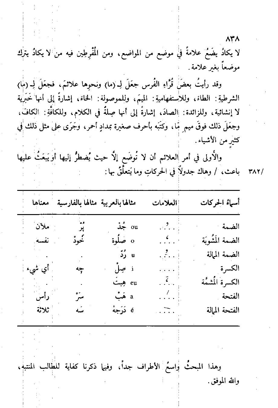 وَالْأولَى فِي أَمر العلائم أَن لَا تُوضَع إِلَّا حَيْثُ يضْطَر إِلَيْهَا أَو يبْعَث عَلَيْهَا باعث / وهاك جدولا فِي الحركات وَمَا يتَعَلَّق بهَا أَسمَاء الحركات العلامات مثالها بِالْعَرَبِيَّةِ مثالها بِالْفَارِسِيَّةِ مَعْنَاهَا الضمة جد بر ملآن الضمة المشوبة صلوة خود نَفسه الضمة الممالة رد الكسرة صل أَي شَيْء الكسرة المشمة هبت جه الفتحة صلى الله عَلَيْهِ وَسلم هَب رَأس الفتحة الممالة دَرَجَة سه ثَلَاثَة