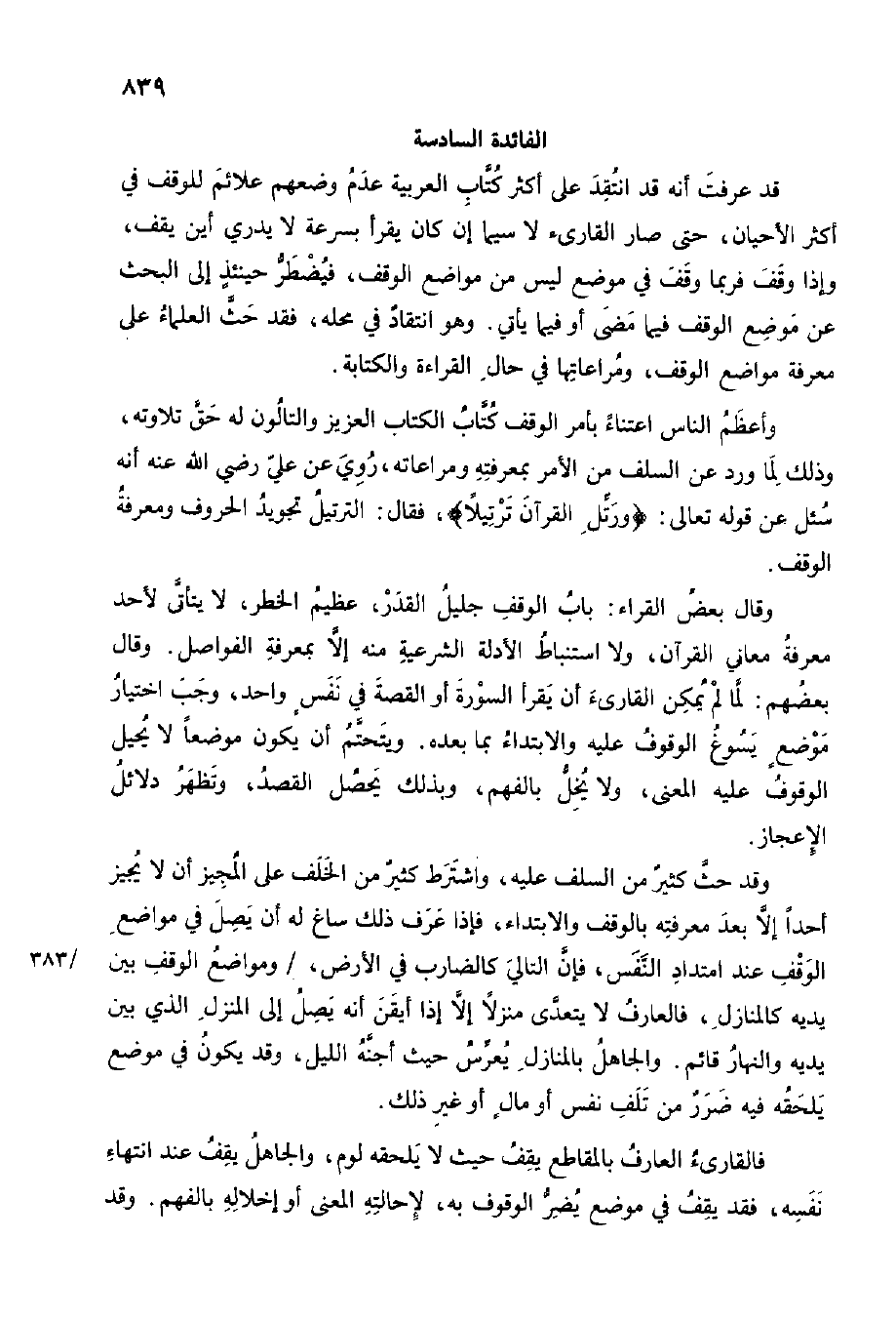 وَقد حث كثير من السّلف عَلَيْهِ وَاشْترط كثير من الْخلف على الْمُجِيز أَن لَا يُجِيز أحدا إِلَّا بعد مَعْرفَته بِالْوَقْفِ والابتداء فَإِذا عرف ذَلِك سَاغَ لَهُ أَن يصل فِي مَوَاضِع الْوَقْف عِنْد امتداد النَّفس فَإِن التَّالِي كالضارب فِي الأَرْض / ومواضع الْوَقْف بَين يَدَيْهِ كالمنازل فالعارف لَا يتَعَدَّى منزلا إِلَّا إِذا أَيقَن أَنه يصل إِلَى الْمنزل الَّذِي بَين يَدَيْهِ وَالنَّهَار قَائِم وَالْجَاهِل بالمنازل يعرس حَيْثُ أجنه اللَّيْل وَقد يكون فِي مَوضِع يلْحقهُ فِيهِ ضَرَر من تلف نفس أَو مَال أَو غير ذَلِك